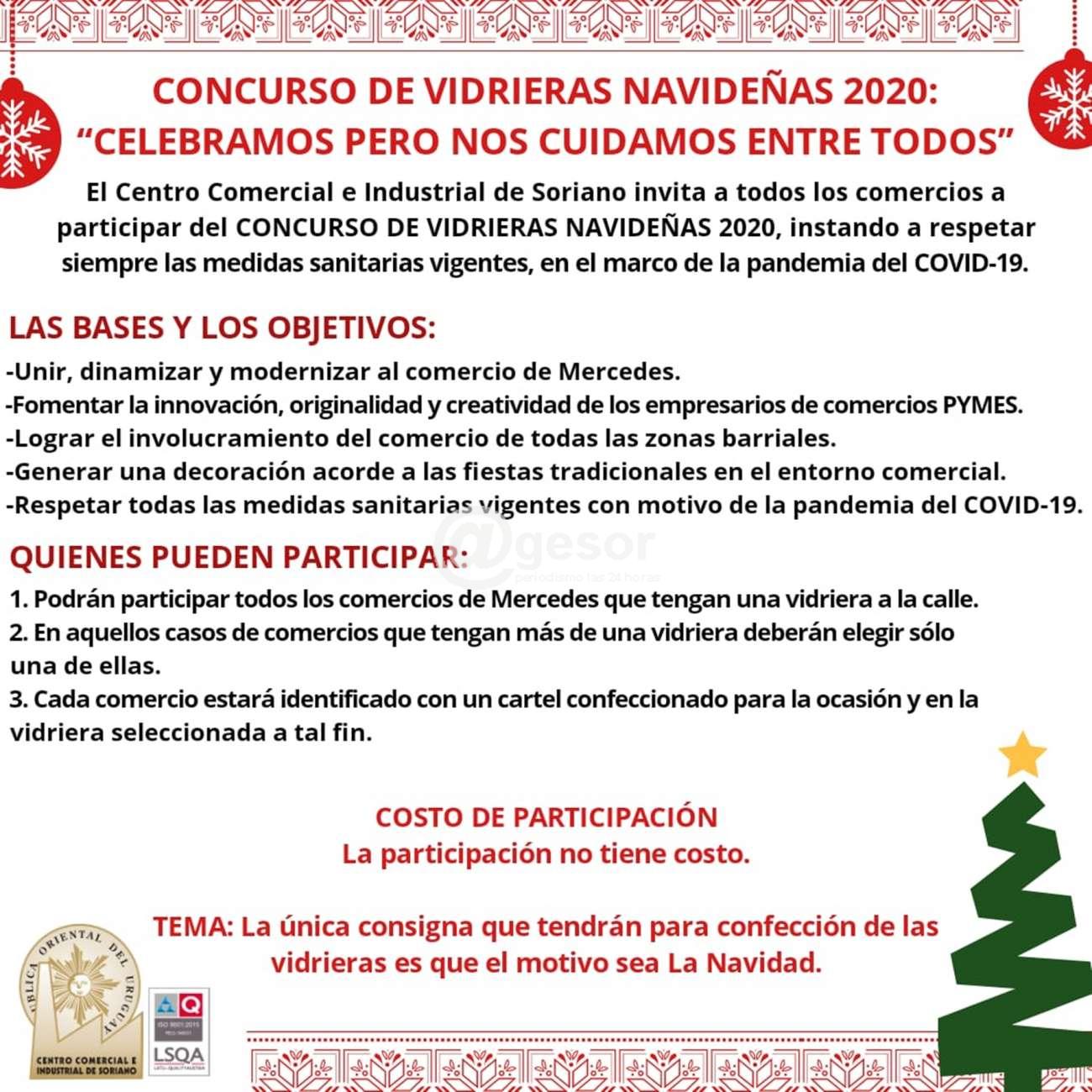 El Centro Comercial e Industrial de Soriano invita a todos los comercios a participar del CONCURSO DE VIDRIERAS NAVIDEÑAS 2020, instando a respetar siempre las medidas sanitarias vigentes, en el marco de la pandemia del COVID-19.
