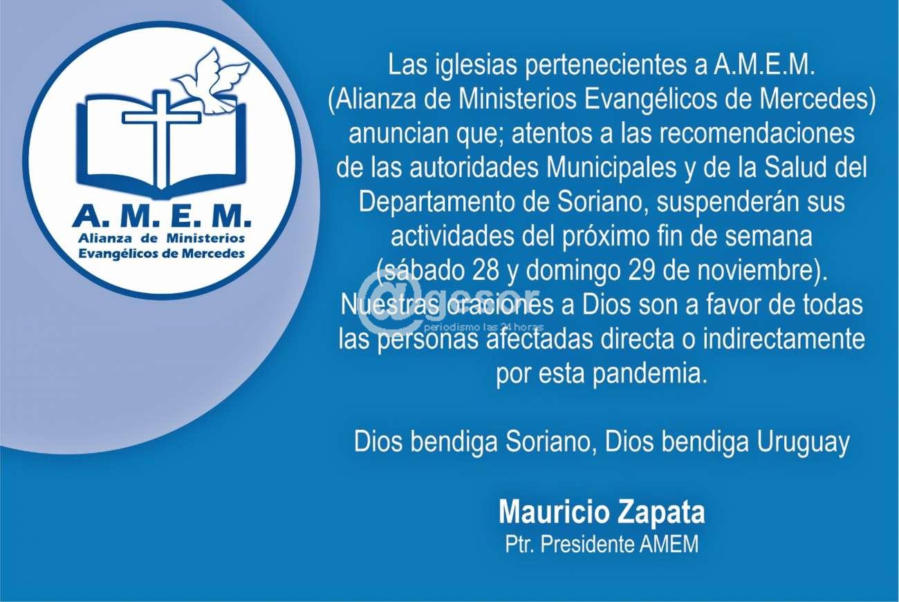 Las iglesias pertenecientes a A.M.E.M. (Alianza de Ministerios Evangélicos de Mercedes) anuncian que, atentos a las recomendaciones de las autoridades municipales y de la salud de Soriano, suspenderán sus actividades del próximo fin de semana (sábado 28 y domingo 29 de noviembre).