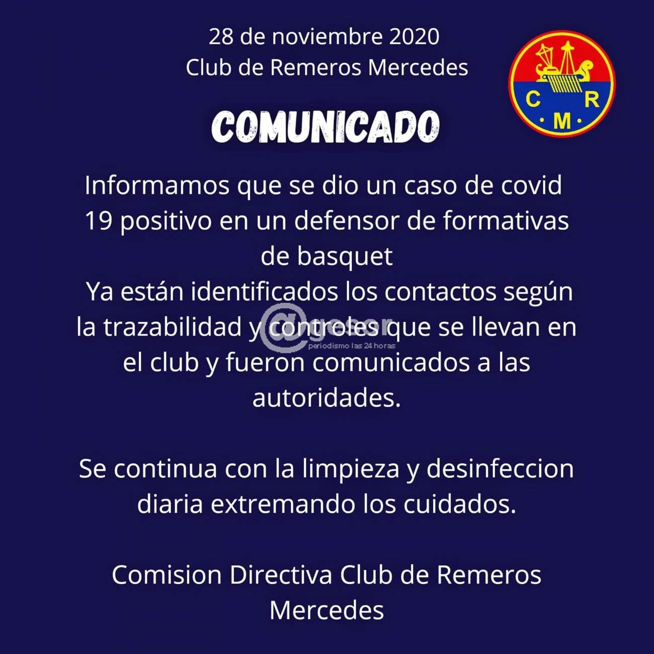 El Club Remeros Mercedes emitió comunicado en el que informa sobre la detección de un caso covid 19 positivo en un defensor de formativas de basquet. Señaló que ya están identificados los contactos según la trazabilidad y controles que se llevan en el club y fueron comunicados a las autoridades.