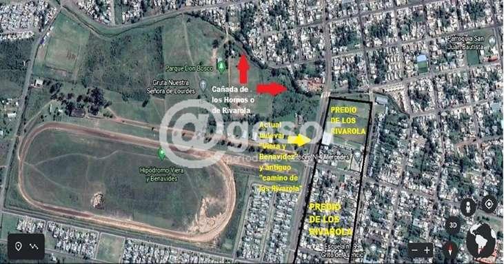 A continuación, se agrega una nueva imagen en donde puede apreciarse el actual Hipódromo, la Cañada de Hornos o de Rivarola, los predios que pertenecían a los Rivarola y el actual bulevar «Viera y Benavídez” o antiguo «camino de Rivarola».