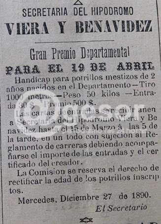 p.m. con el objeto de proceder a la elección de 3 miembros del Directorio y tratar la creación de socios suscriptores y distribución entre los accionistas del terreno sobrante del Hipódromo. Mercedes, 10 de marzo de 1891. El Secretario».28
