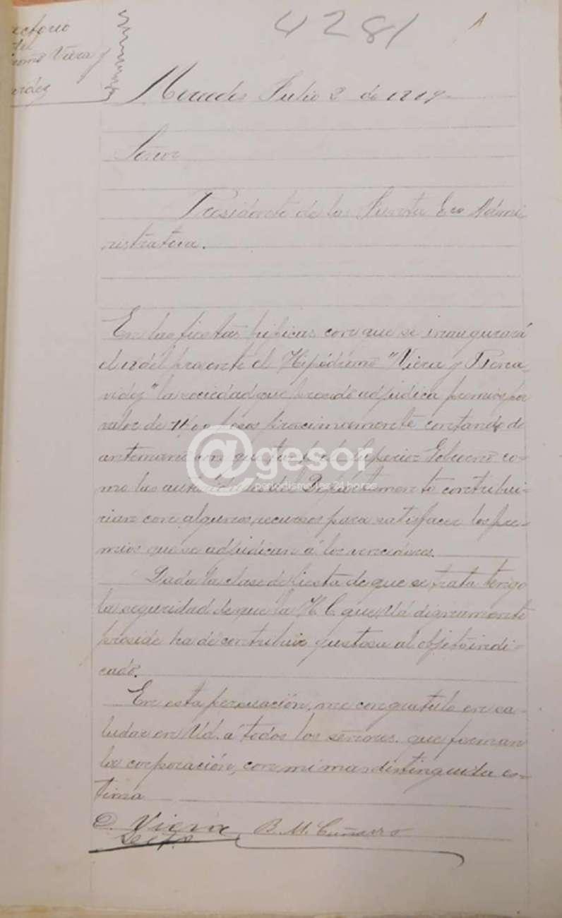 Seguramente uno de los primeros documentos que existen de la sociedad que construyó las instalaciones del Hipódromo «Viera y Benavídez», es la nota que luce en la siguiente página, firmada por su presidente, el Dr. Benito Cuñarro y el secretario D. Viera, fechada el 2 de julio de 1889, que, dirigida al Presidente de la Junta Económico Administrativa de Soriano, solicitaba colaboración para los premios a otorgarse «En las fiestas hípicas con que se inaugurará el 18 del presente, el Hipódromo “Viera y Benavídez”».21
