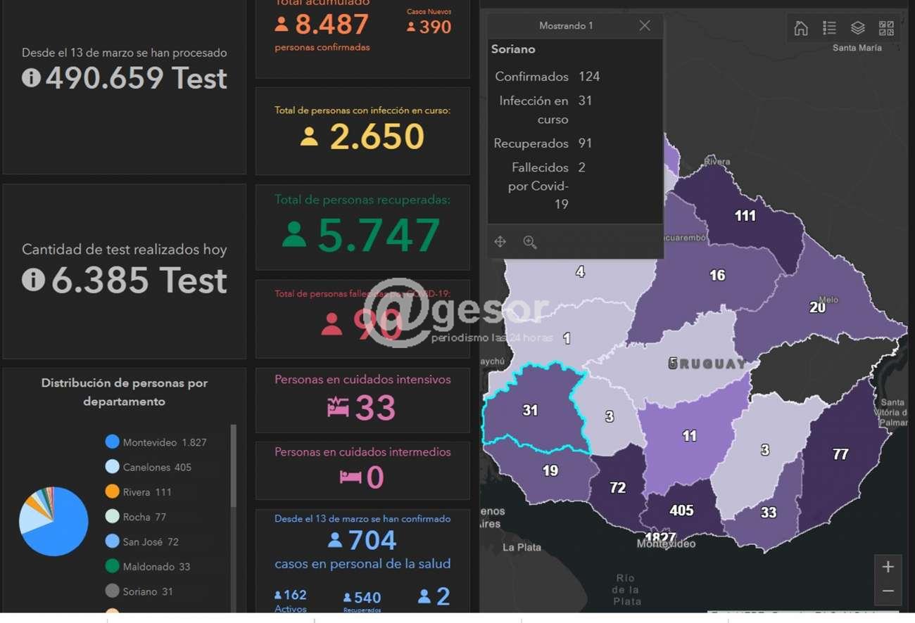 Los departamentos con casos activos son 18: Artigas, Canelones, Cerro Largo, Colonia, Durazno, Flores, Florida, Lavalleja, Maldonado, Montevideo, Paysandú, Río Negro, Rivera, Rocha, Salto, San José, Soriano y Tacuarembó.