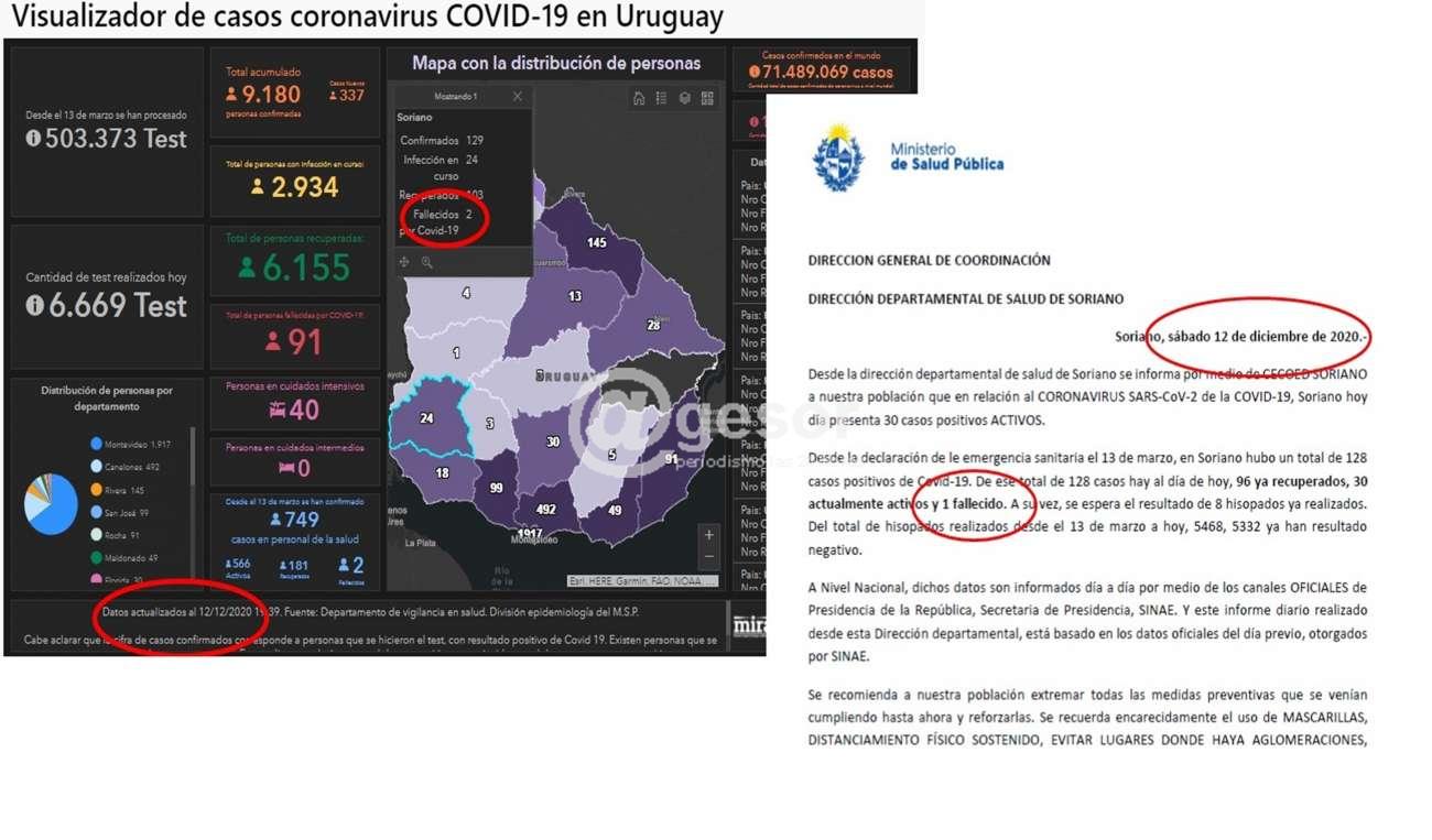 Cabe puntualizar que el Director del Hospital Mercedes plateó la duda al momento del desenlace fatal (ver: http://www.agesor.com.uy/noticia.php?id=47789 ). Ahora el Dr. Saráchaga contradice al Sinae indicando que en Soriano se ha registrado solamente un fallecimiento producto de Coronavirus.