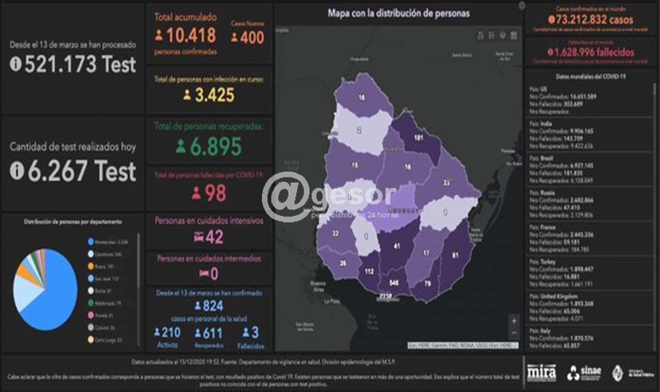 Sistema Nacional de Emergencias reportó 3.425 casos activos de COVID-19. Con el análisis de 6.267 pruebas para la detección de COVID-19, este martes 15 fueron identificados 400 casos nuevos, 267 en Montevideo, 45 en Canelones, 37 en Rivera, 12 en Maldonado, 11 en San José, 8 en Florida, 7 en Rocha, 3 en Paysandú, 2 en Artigas, 2 en Cerro Largo, 2 en Colonia, 2 en Tacuarembó, 1 en Durazno y 1 en Treinta y Tres, informó el Sinae. Hay 3.425 casos activos, 42 en cuidados intensivos.
