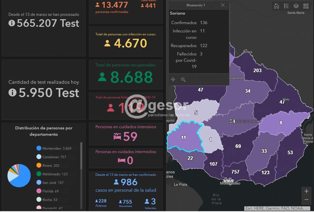 En Soriano este lunes se registraron dos casos nuevos de Covid-19 por lo que los casos confirmados desde el inicio de la pandemia el 13 de marzo pasaron a ser 136, de los cuales hay 122 personas recuperadas, los activos pasaron de 9 a 11 y se mantienen 3 fallecidos.