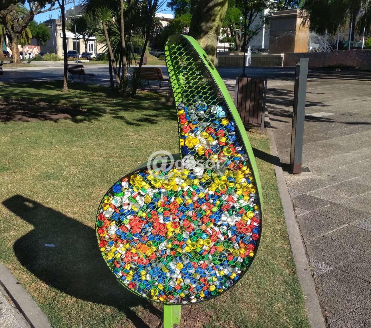 Estas estructuras fueron confeccionadas en Talleres Municipales y tienen la forma del isotipo de la Intendencia, con una abertura para poder colocar tapitas plásticas de refrescos.
