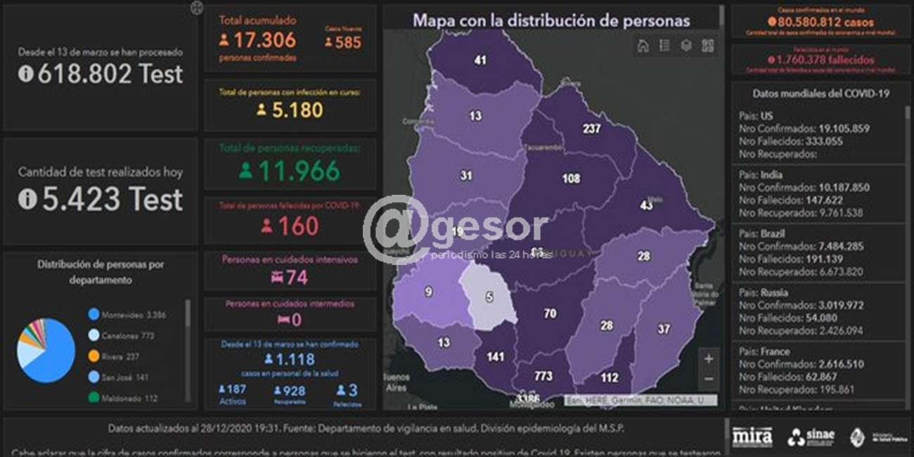 De acuerdo a la información proporcionada por el Ministerio de Salud Pública (MSP), hoy se llevaron a cabo 5.423 análisis y se detectaron 585 nuevos casos de Coronavirus COVID-19. De los 585 casos nuevos, 416 son de Montevideo, 58 de Canelones, 39 de Rivera, 25 de San José, 15 de Maldonado, 11 de Cerro Largo, 6 de Lavalleja, 5 de Río Negro, 4 de Rocha, 2 de Artigas, 2 de Colonia, 1 de Paysandú y 1 de Tacuarembó. En cuanto al trazo epidemiológico se mantienen los brotes informados en los últimos días. En todos los casos se trabaja en un estricto seguimiento epidemiológico.