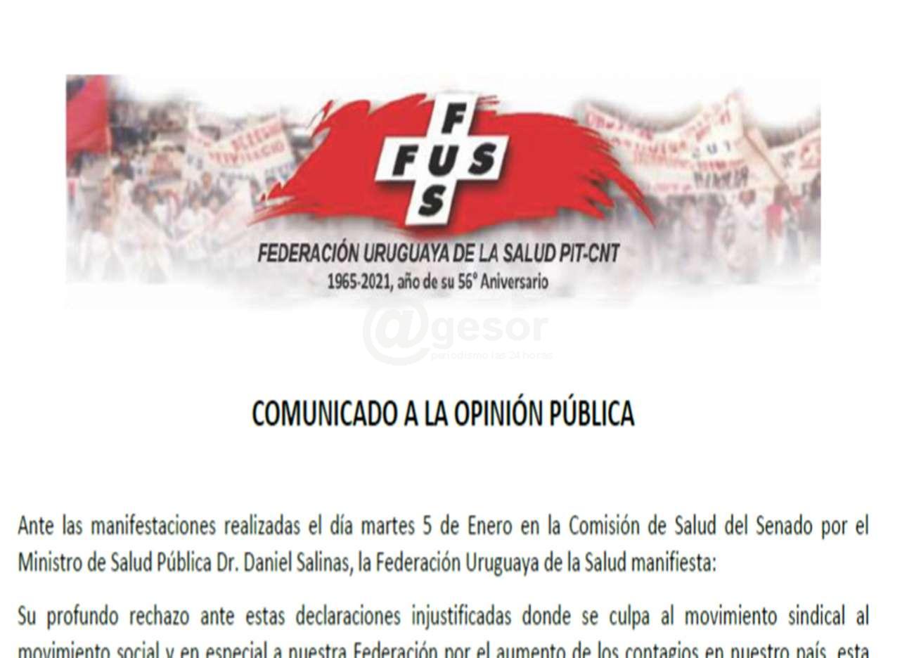 Ante las manifestaciones realizadas el día martes 5 de Enero en la Comisión de Salud del Senado por el Ministro de Salud Pública Dr. Daniel Salinas, la Federación Uruguaya de la Salud manifiesta: