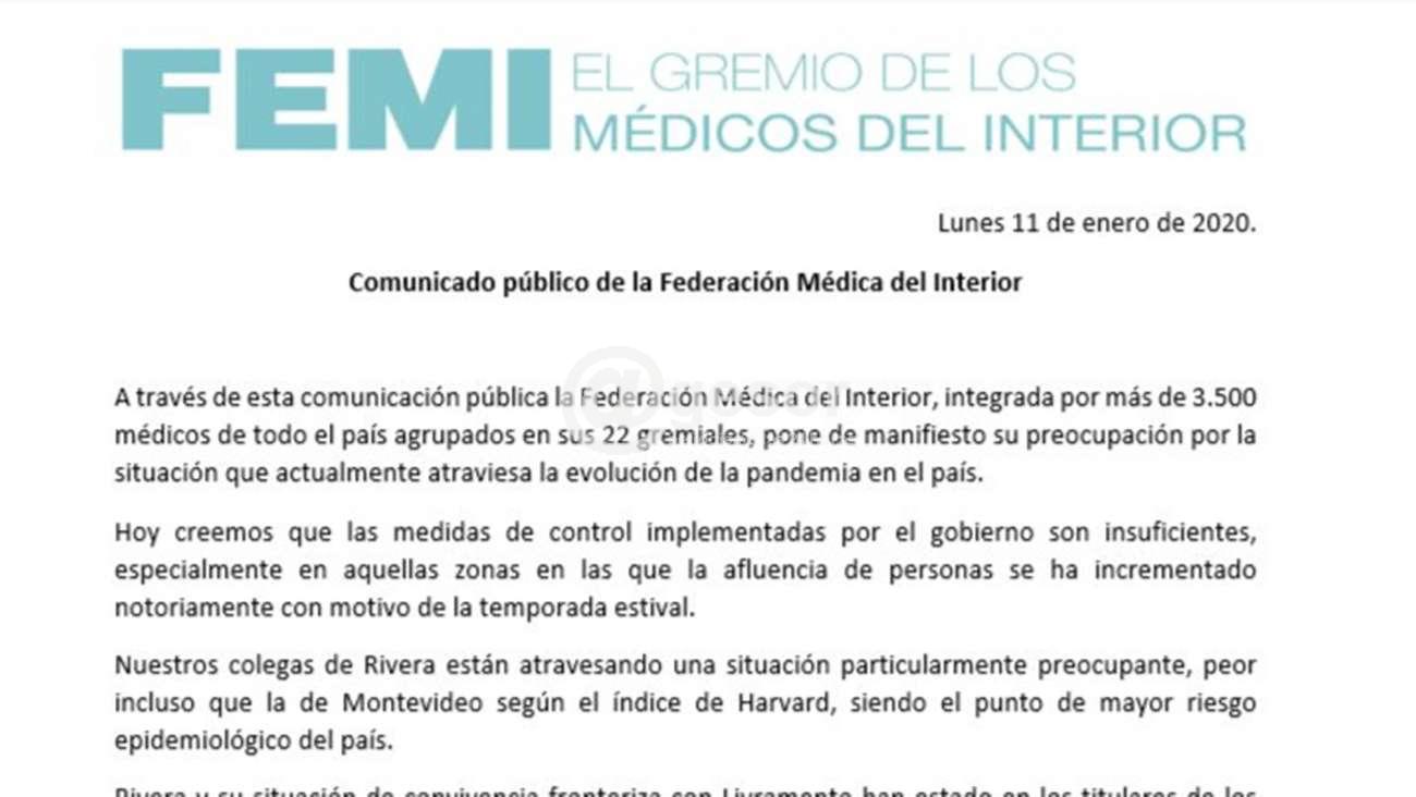Mediante un comunicado la Federación Médica del Interior expresó su preocupación por el aumento de los contagios de Coronavirus que viene registrándose en el país. Acotando que “los gremios médicos de FEMI están a disposición para poder integrarse al trabajo de cada Cecoed y desde allí elaborar en conjunto las mejores medidas para cada lugar”.