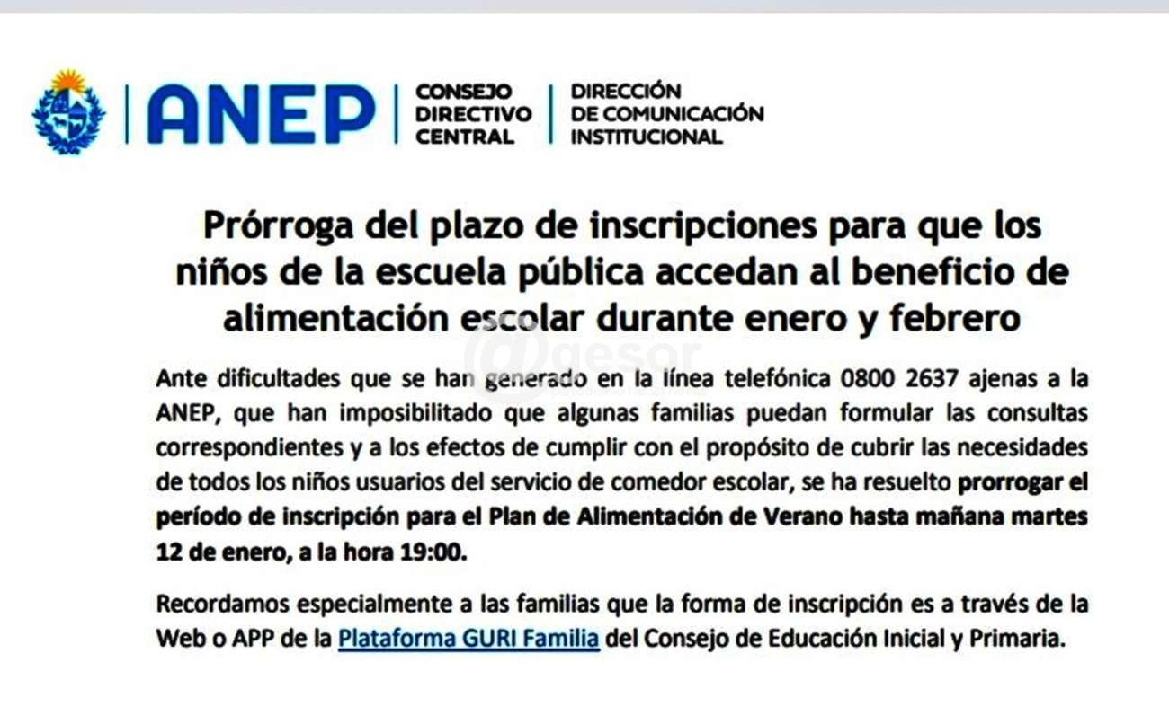 "Ante dificultades que se han generado en la línea telefónica 0800 2637 ajenas a la ANEP, que han imposibilitado que algunas familias puedan formular las consultas correspondientes y a los efectos de cumplir con el propósito de cubrir las necesidades de todos los niños usuarios del servicio de comedor escolar, se ha resuelto prorrogar el período de inscripción para el Plan de Alimentación de Verano hasta este martes 12 de enero, a la hora 19.00.