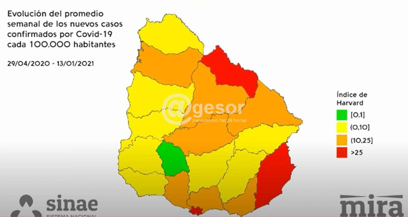 El equipo de Información de la Dirección Nacional de Emergencias elaboró un mapa animado que muestra la evolución del promedio semanal de los nuevos casos confirmados por Covid-19 cada 100.000 habitantes en Uruguay según el Índice de Harvard.
