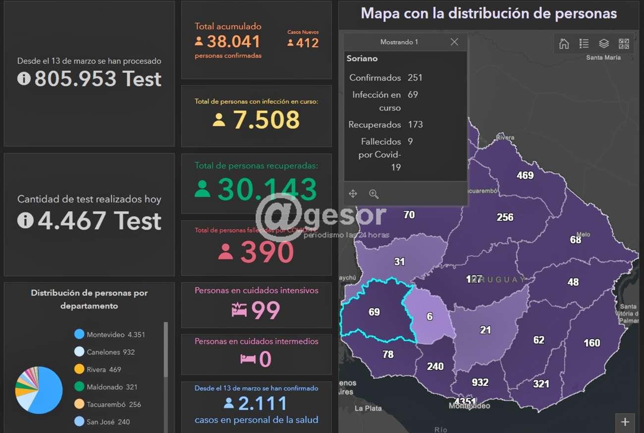 De acuerdo a la información proporcionada por el Ministerio de Salud Pública (MSP), hoy se llevaron a cabo 4.467 análisis y se detectaron 412 nuevos casos de Coronavirus COVID-19. De los 412 casos nuevos, 253 son de Montevideo, 43 de Rivera, 42 de Canelones, 24 de Maldonado, 10 de Colonia, 9 de San José, 8 de Artigas, 7 de Rocha, 5 de Tacuarembó, 3 de Lavalleja, 3 de Río Negro, 2 de Durazno, 2 de Salto y 1 de Treinta y Tres.