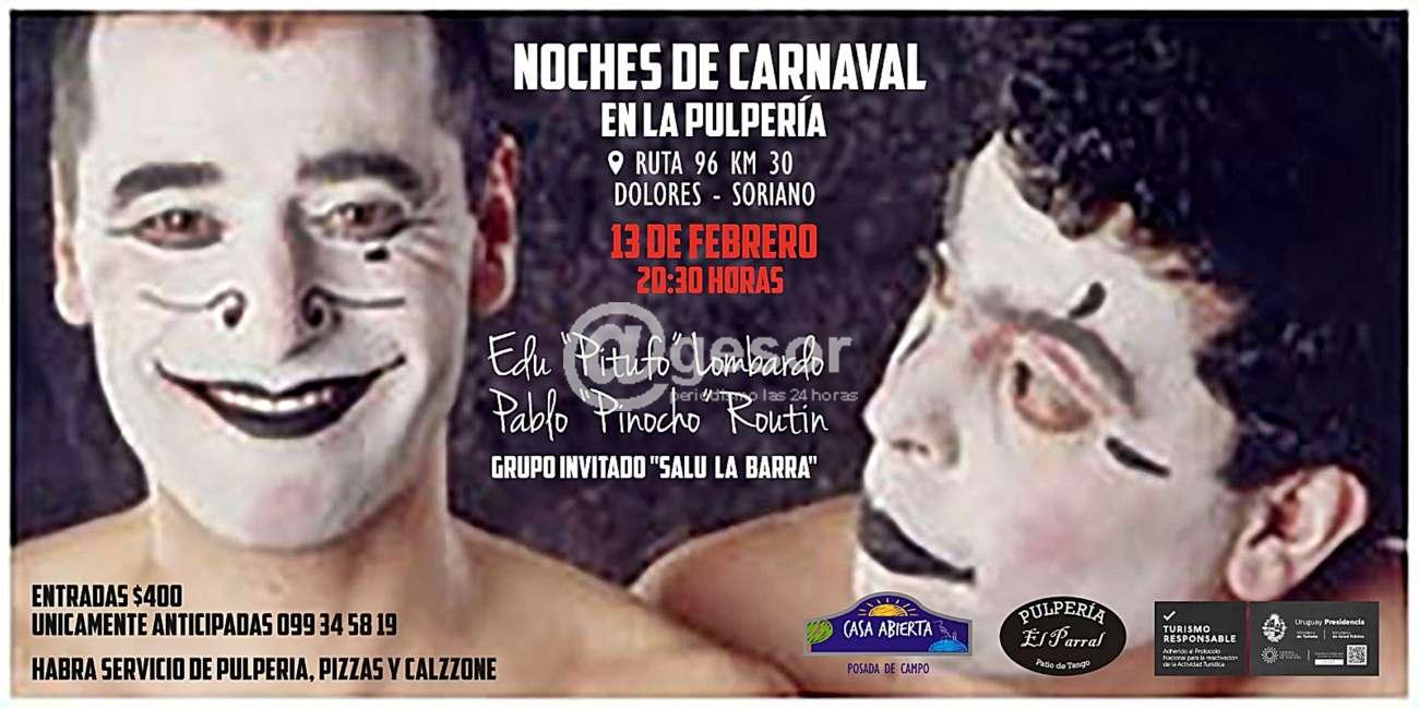 El sábado 13 de febrero a las 20.30 horas en "La Pulpería El Parral" ubicada en Ruta 96 km 30 inmediaciones de Dolores (Soriano) podrá disfrutarse de una ¨Noche de Carnaval" con la presencia de Edu "Pitufo" Lombardo y Pablo "Pinocho" Routin teniendo con invitado al grupo "Salú la Barra".