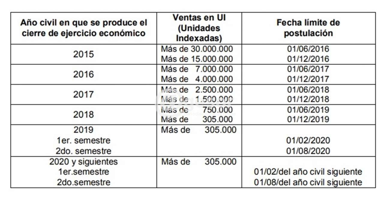 De acuerdo a la Res. Nº 3.012/2015, se encuentran obligados a postularse los sujetos pasivos de impuestos administrados por la DGI, cuyas ventas superen los importes determinados en el siguiente cuadro.