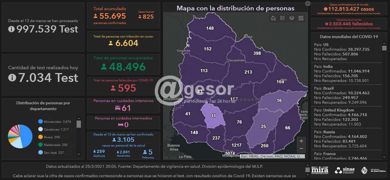 De acuerdo a la información proporcionada por el Ministerio de Salud Pública (MSP), hoy se llevaron a cabo 7034 análisis y se detectaron 825 nuevos casos de Coronavirus COVID-19. De los 825 casos nuevos, 413 son de Montevideo, 110 de Canelones, 87 de Rivera, 45 de Tacuarembó, 26 de Cerro Largo, 20 de Durazno, 20 de Maldonado, 18 de Colonia, 15 de San José, 14 de Río Negro, 13 de Salto, 9 de Paysandú, 9 de Rocha, 8 de Artigas, 8 de Florida, 3 de Flores, 3 de Treinta y Tres, 2 de Lavalleja y 2 de Soriano. En todos los casos se trabaja en un estricto seguimiento epidemiológico. Desde que se declaró la emergencia sanitaria el 13 de marzo se han procesado 997.539 tests y se han registrado 55.695 casos positivos de Coronavirus en todo el territorio nacional. De ese total 48.496 ya se recuperaron. Hoy se confirmaron 4 fallecimientos con diagnóstico de SARS-CoV-2 en nuestro país. Se trata de 2 pacientes de Maldonado de78 y 86 años y 2 pacientes de Montevideo de 69 y 89 años. Hasta el momento son 595 las defunciones con diagnóstico de COVID-19 en Uruguay. Actualmente hay 6604 casos activos, es decir personas que están cursando la enfermedad, 61 de ellas se encuentra en cuidados intensivos. Del total de casos positivos confirmados, 3105 corresponden a personal de la salud. 2841 de ellos ya se recuperaron, 259 están cursando la enfermedad y 5 fallecieron. Al día de hoy en los 19 departamentos se registran casos activos. ACLARACIÓN: El total de casos positivos confirmados hasta ayer era 54.874. Hoy se reportan 825 casos nuevos y un total de 55.695 casos positivos confirmados. La diferencia se explica porque 4 casos fueron eliminados.