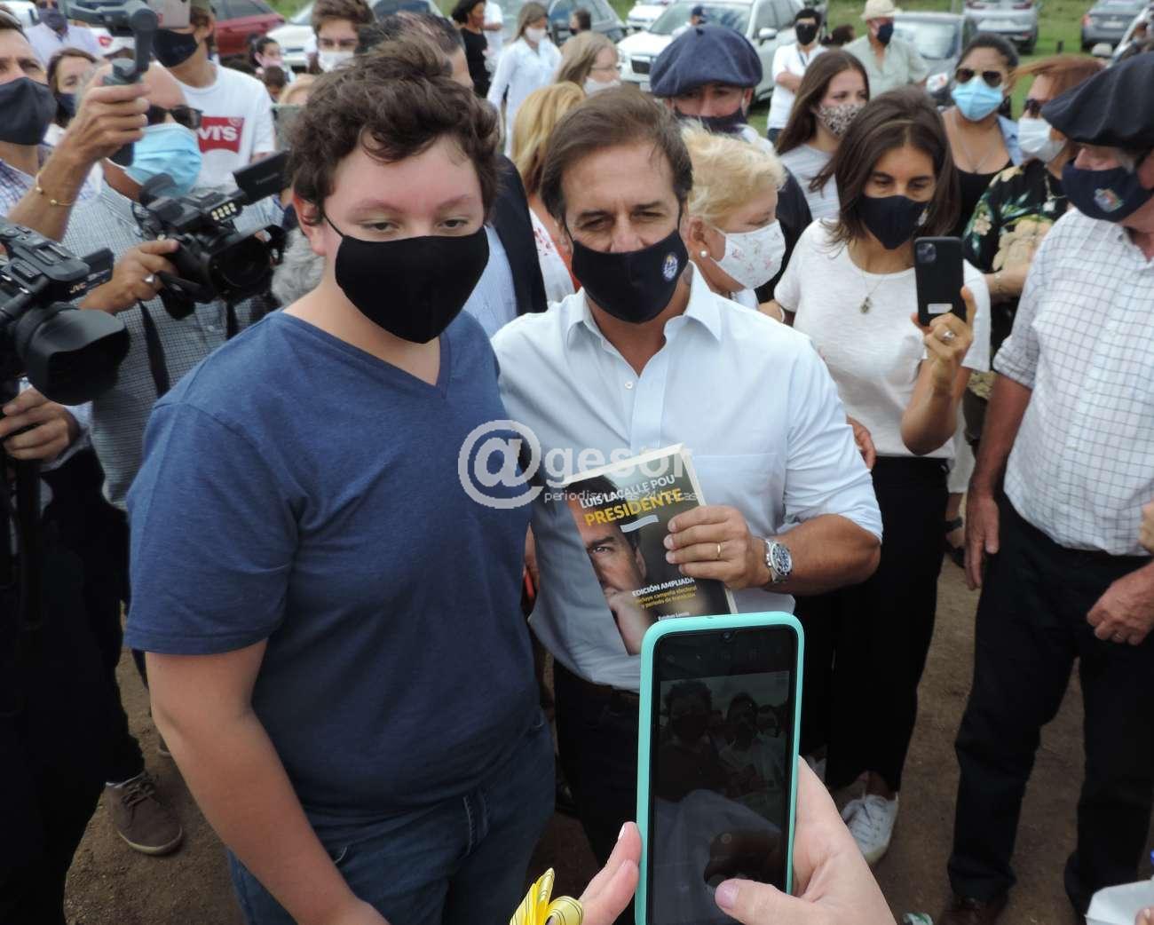 Entre todos los que se agruparon junto al Presidente se acercó un adolescente, con un libro en la mano para que se lo firmara. El libro en cuestión “Luis Lacalle Pou Presidente” de Esteban Leonis, donde se recoge el período de la campaña electoral, la construcción de la coalición, el resultado electoral y toda la transición hasta quince días antes de asumir como presidente.