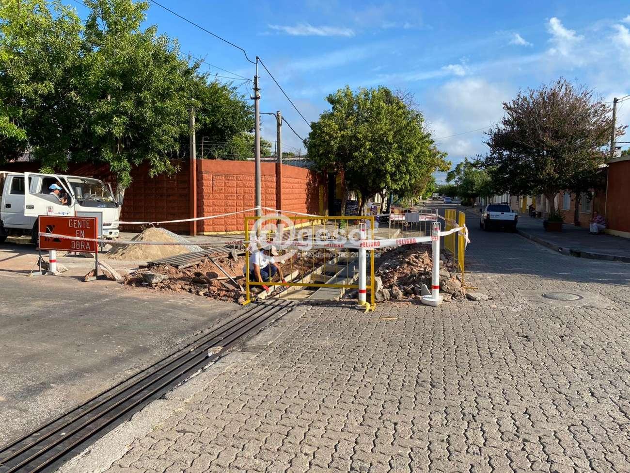 Allí se está cambiando la estructura metálica del registro para pluviales, ya que se había hundido generando inconvenientes a los vehículos que pasan por el lugar. Debido a que fue necesario recomponer la base estructural y posteriormente aplicar hormigón, los trabajos se han extendido por varias jornadas.