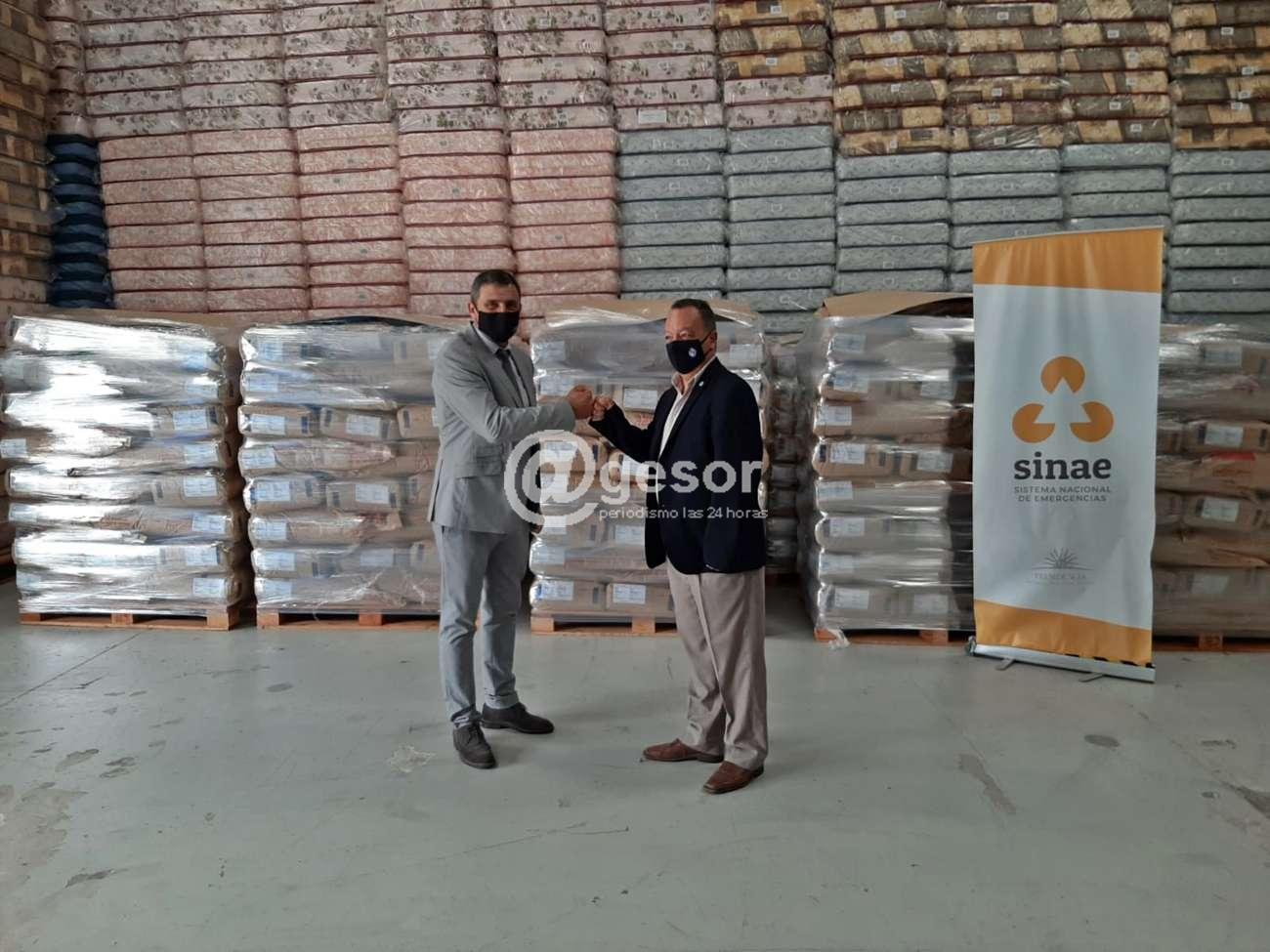El vicepresidente de la empresa Alejandro Pérez Viazzi y el director nacional de Emergencias Sergio Rico, en las instalaciones del Centro Logístico y de Distribución del SINAE haciendo efectiva la donación.