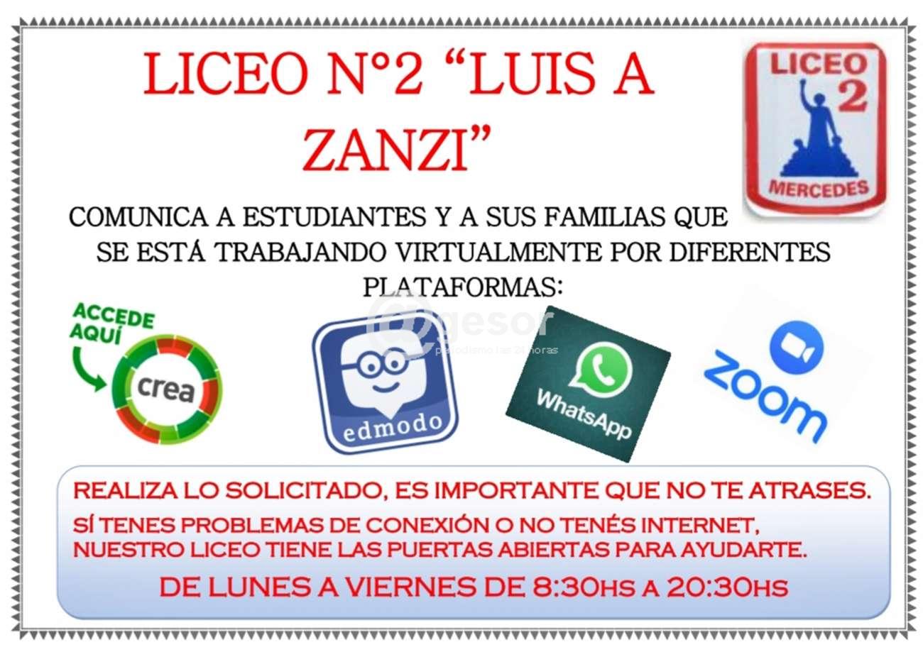 Desde el Liceo Nº 2 "Luis A. Zanzi" de Mercedes, se informa a estudiantes y a sus familias que se está trabajando virtualmente por diferentes plataformas: CREA, EDMODO, WHATSAPP, ZOOM.
