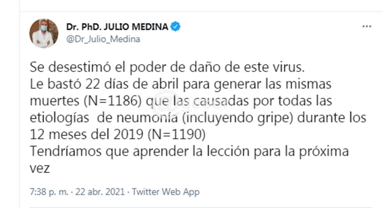 “Se desestimó el poder de daño de este virus”, opinó el Dr. Julio Medina en su cuenta de twitter. Medina, Prof. Director de la Cátedra de Enfermedades Infecciosas (UdelaR), explicó el poder letal que viene teniendo el coronavirus SARS-CoV-2 en los últimos meses en nuestro país: “Se desestimó el poder de daño de este virus. Le bastó 22 días de abril para generar las mismas muertes (N=1186) que las causadas por todas las etiologías de neumonía (incluyendo gripe) durante los 12 meses del 2019 (N=1190) Tendríamos que aprender la lección para la próxima vez”.