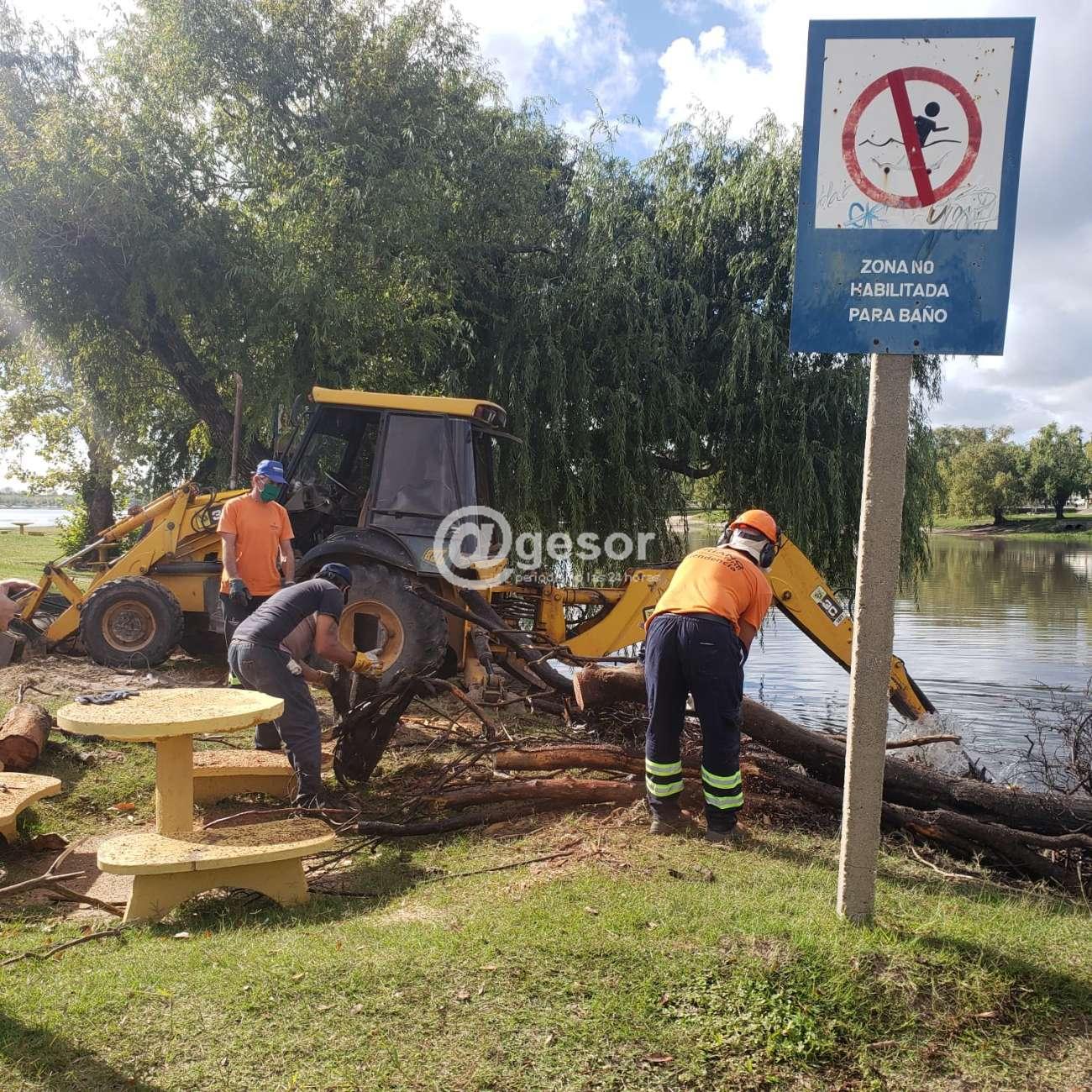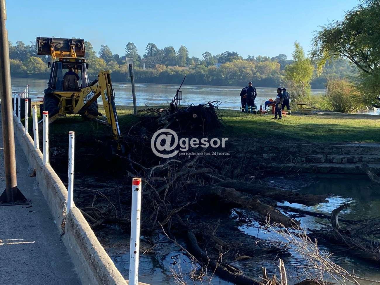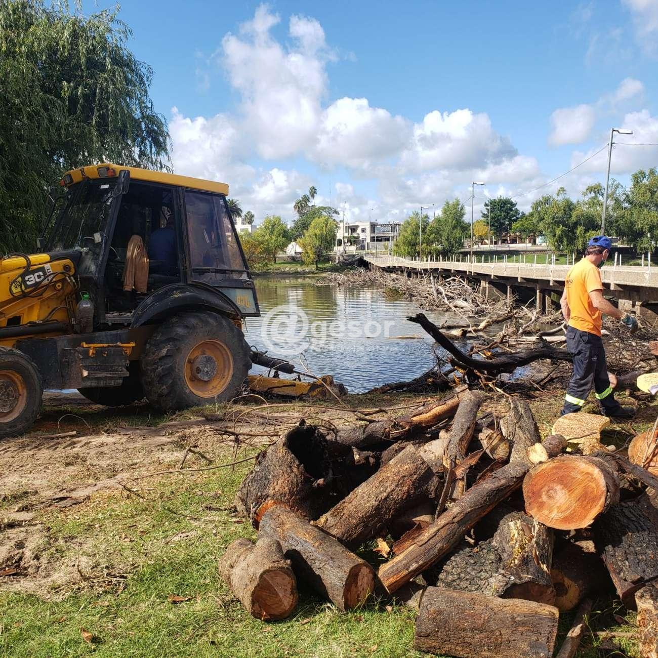 Con un importante despliegue de personal y maquinaria, la Intendencia de Soriano está realizando una intervención en la zona de la pasarela que conecta con la isla “Del puerto” en Mercedes para retirar troncos y ramas atascadas.