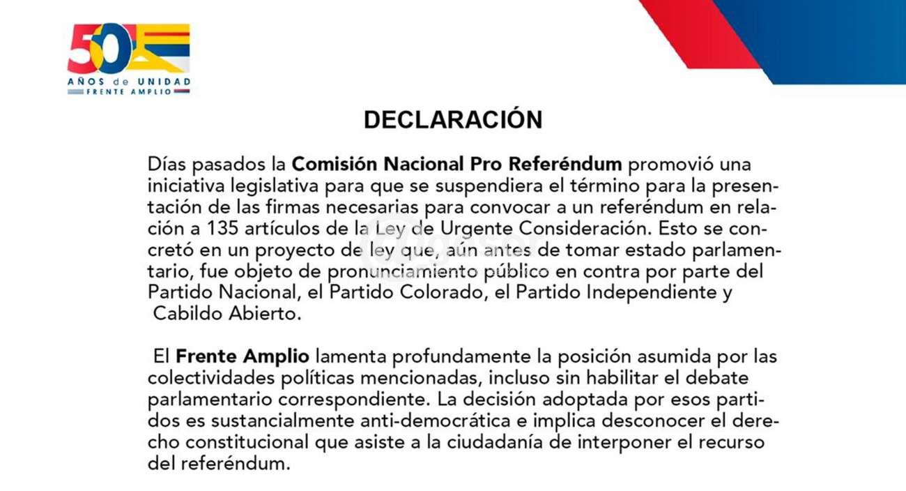 El Frente Amplio lamenta profundamente la posición asumida por las colectividades políticas mencionadas, incluso sin habilitar el debate parlamentario correspondiente. La decisión adoptada por esos partidos es sustancialmente anti-democrática e implica desconocer el derecho constitucional que asiste a la ciudadanía de interponer el recurso del referéndum.