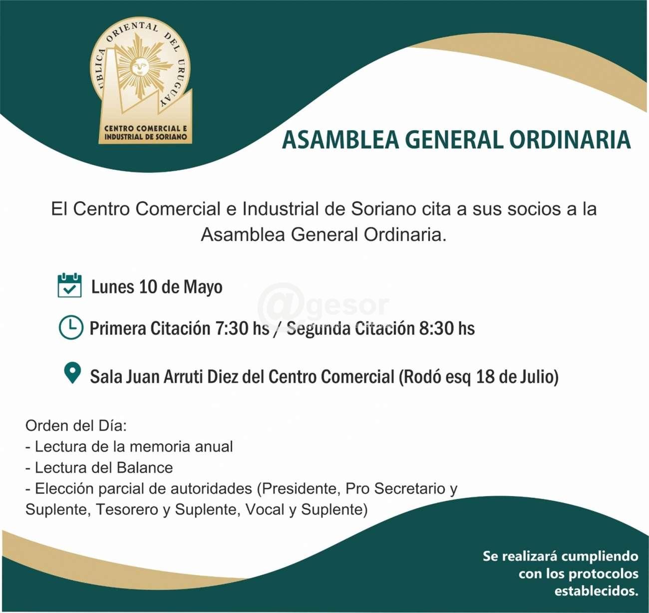 El Centro Comercial e Industrial de Soriano cita a sus socios para la Asamblea General Ordinaria.