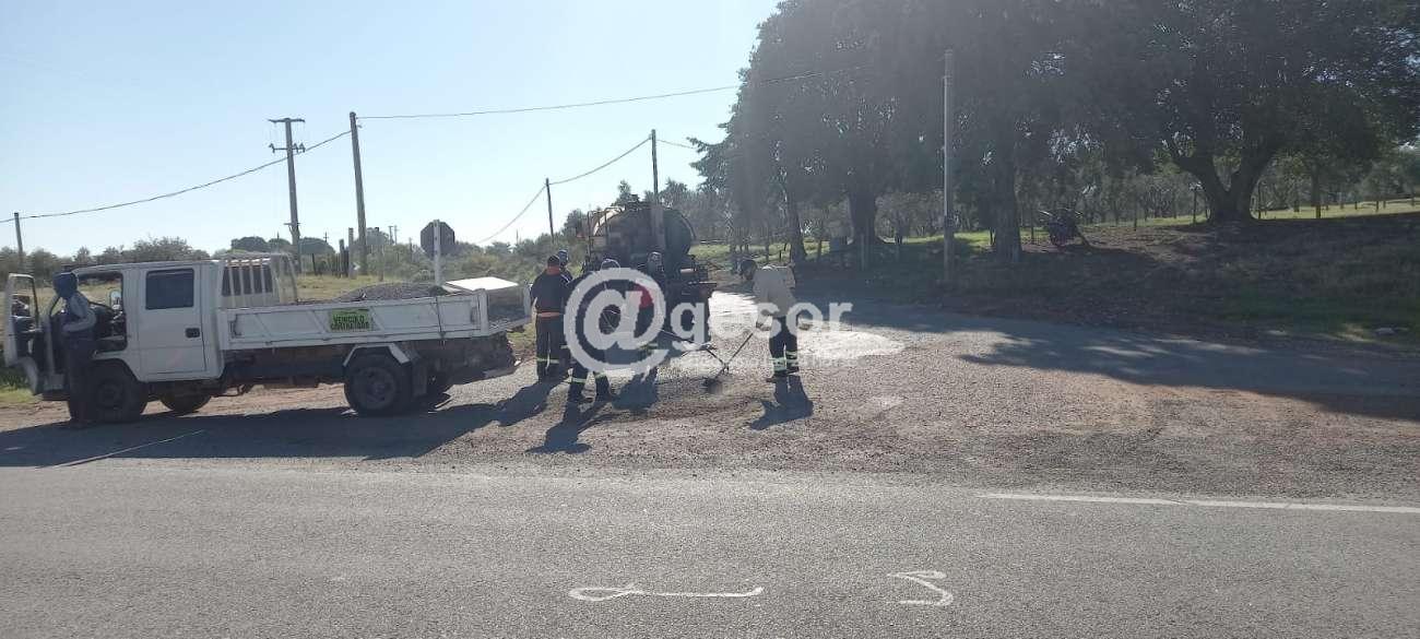 En el acceso del camino a paraje Pense desde ruta 2, frente a capilla San Enrique, se efectúa bacheo con asfalto en caliente y gravilla.