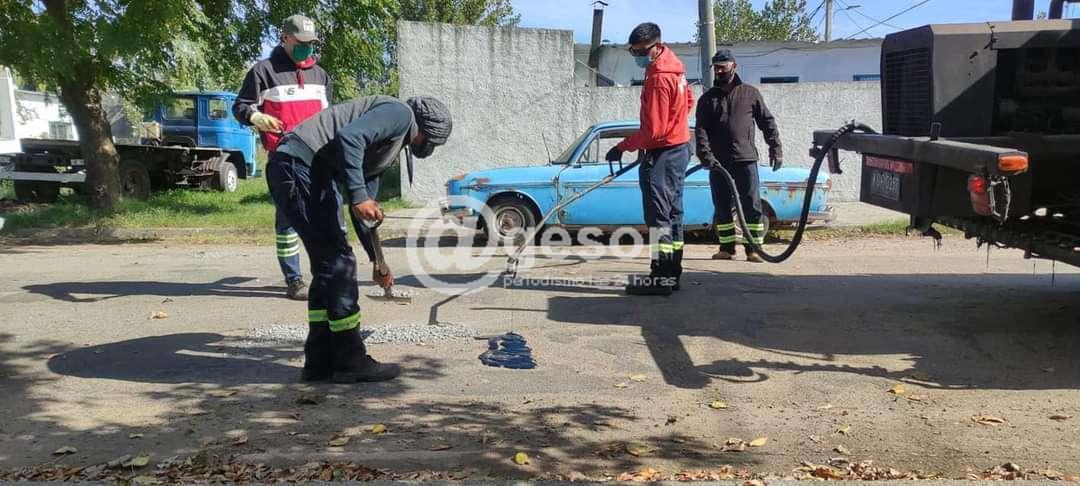 De forma paralela se avanza en el mantenimiento de pavimentos en las calles de varios puntos de la ciudad, en estos casos realizando bacheo con asfalto en caliente y gravilla.
