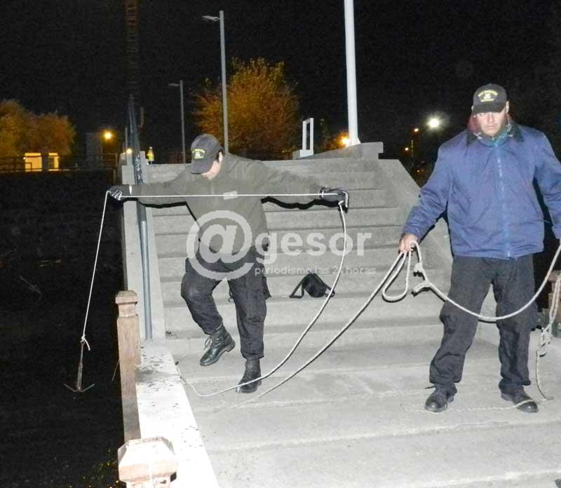 Personal de Prefectura del puerto de Mercedes enterado de la situación se hizo presente en el muelle y allí primero realizó visualización de la zona y posteriormente rastrillaje desde el muelle sin ninguna novedad. A la 1.30 horas se retiró tanto el personal de Prefectura como el de Tránsito y el sereno que estaban allí, para retomar la búsqueda si es que no aparece antes, en la mañana temprano. Por el momento todo se basa en el testimonio de este sereno y en la aparición de la botellita con vino y el tabaco.