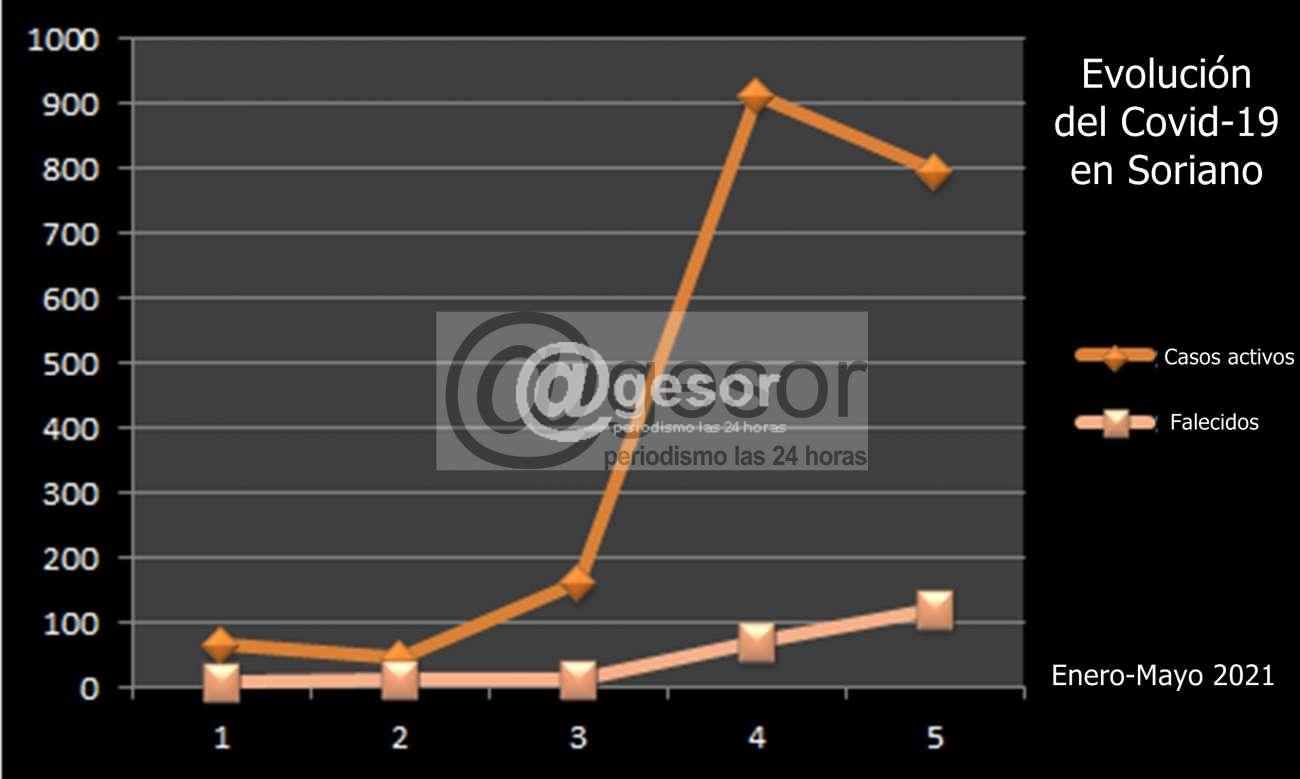 En base a los datos disponibles a través de la página del SINAE surge que actualmente Soriano tiene 792 casos activos (datos al domingo 23 de mayo), y realizando un corte mensual de esa información resulta puede apreciarse el crecimiento que experimentó el Covid-19. Si bien los contagios se han estabilizado en una suerte de meseta, la misma es muy alta respecto a la evolución histórica que ha tenido la enfermedad . Todavía estamos muy lejos de los 69 casos activos que tenía Soriano el 23 de enero 2021.