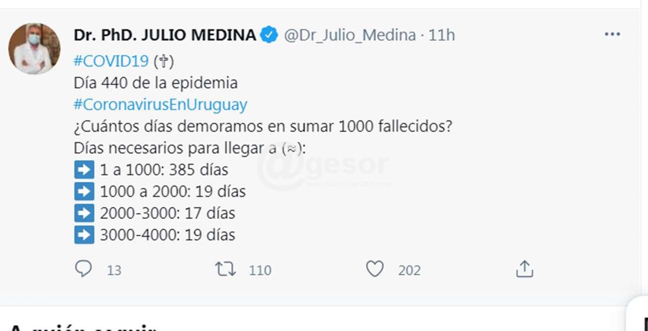 Julio Medina, Prof. Director de la Cátedra de Enfermedades Infecciosas (Udelar) graficó en su cuenta de twitter la evolución de la letalidad que viene teniendo el Coronavirus en nuestro país. Mientras transcurrió un año entre que se registró la primera muerte por Covid-19 y los mil casos fatales, el avance de la enfermedad viene resultando tan devastador, que entre los mil y los dos mil casos transcurrieron solamente 19 días, y así sucesivamente hasta llegar a los 4 mil casos fatales.