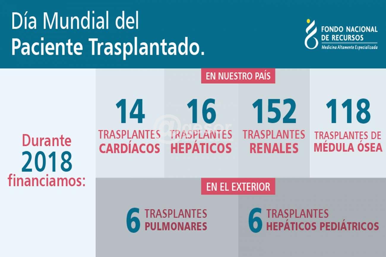 Durante el 2018, financiamos en nuestro país 14 trasplantes cardíacos, 16 trasplantes hepáticos en adultos 152 trasplantes renales y 118 trasplantes de médula ósea. Mientras que en el exterior se realizaron, 6 trasplantes hepáticos pediátricos y 6 trasplantes pulmonares.