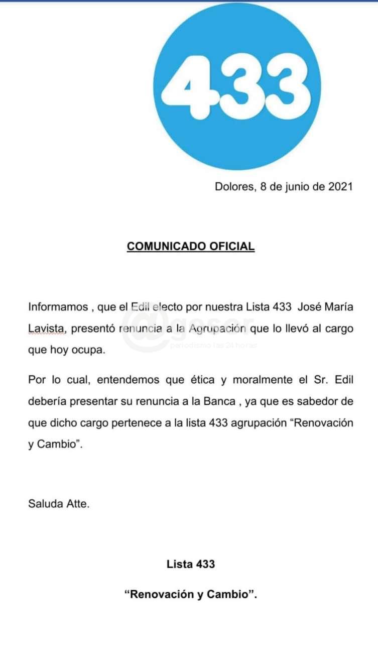 “Informamos que el Edil electo por nuestra Lista 433 José María Lavista, presentó renuncia a la Agrupación que lo llevó al cargo que hoy ocupa.