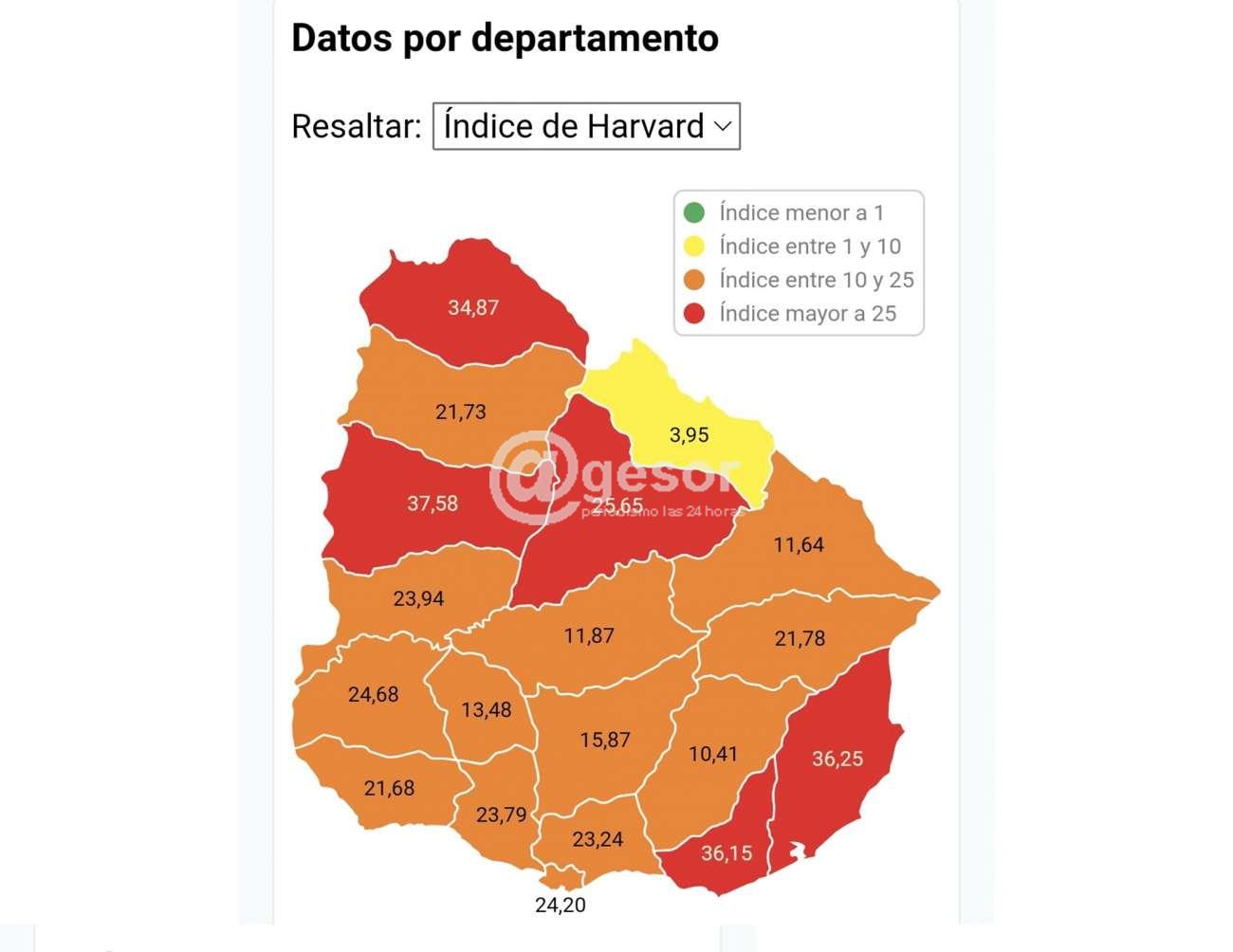 En base a esta información Soriano volvió a ubicarse en zona naranja en base a la escala del índice Harvard. Ya son 13 los departamentos que están en naranja, en esa escala. Rivera permanece en nivel amarillo, en tanto que 5 departamentos siguen en rojo: Artigas, Paysandú, Maldonado y Rocha.