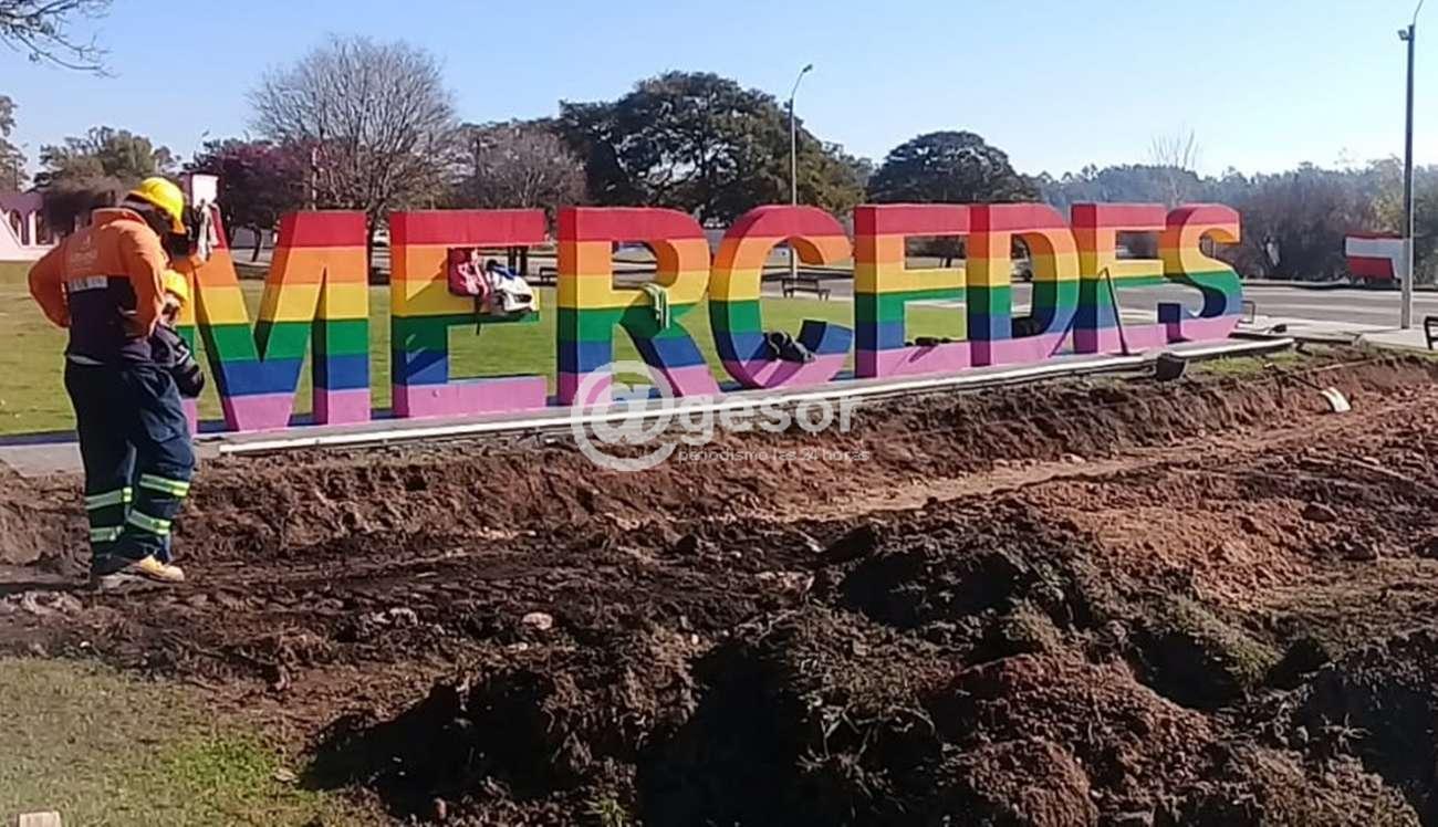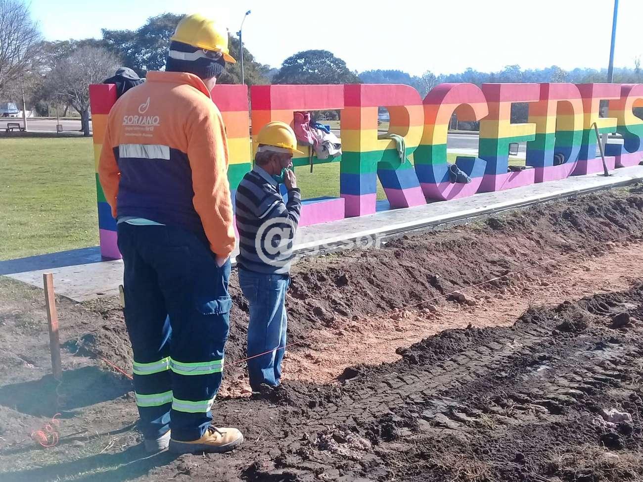 Personal del Departamento de Arquitectura trabaja en la instalación de un nuevo sistema lumínico para las letras corpóreas de Mercedes situadas en predio de plaza "Encuentro de las dos culturas".