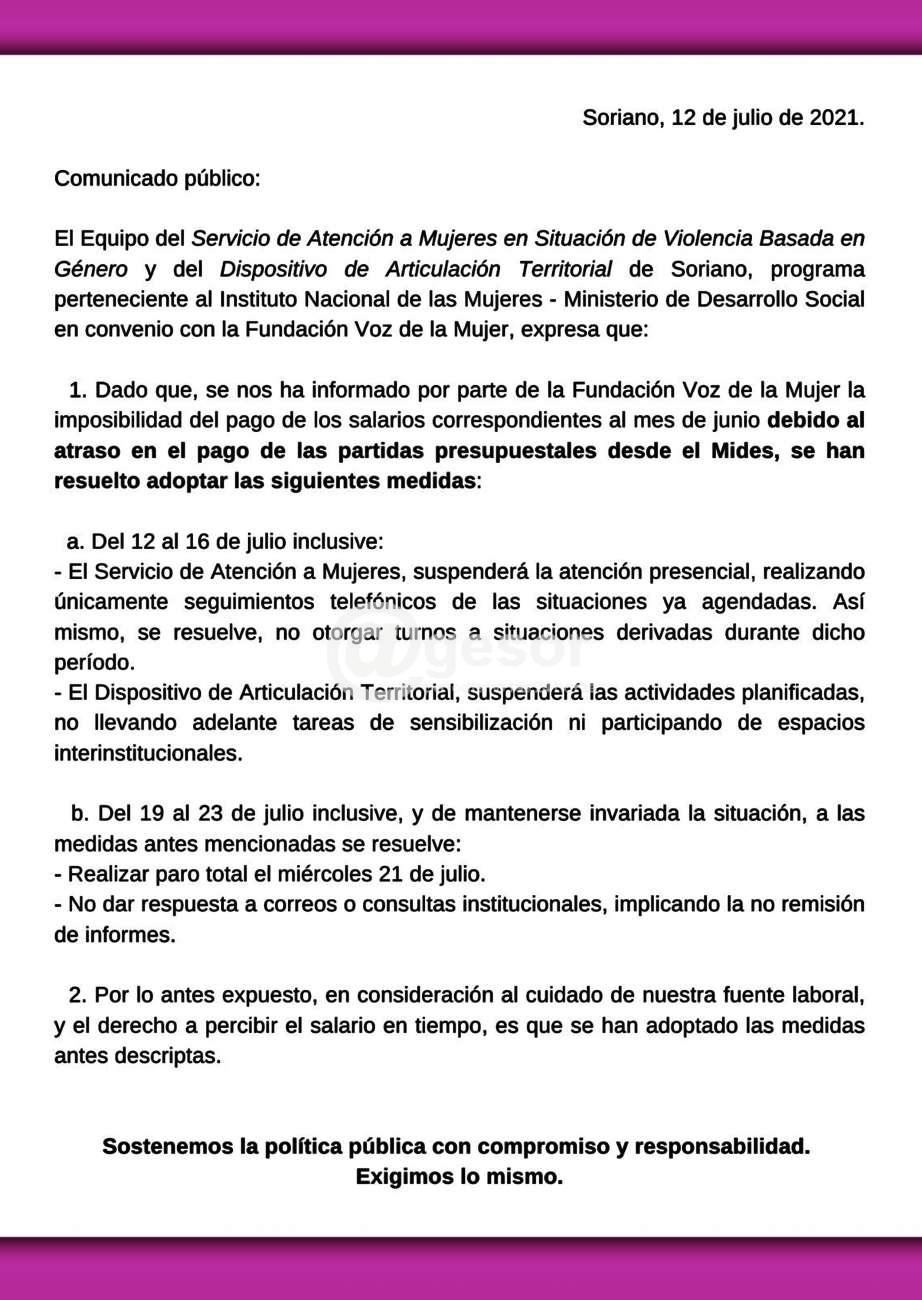 Equipo del servicio de Atención a Mujeres en Situación de Violencia Basada en Género y del Dispositivo de Articulación Territorial del Soriano reduce atención del 13 al 16 de julio por no pago de sueldo de junio