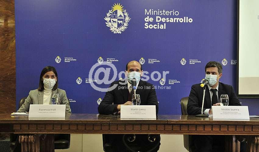 Lema presentó, en una conferencia en la sede ministerial, el Plan Nacional de Cuidados para el período 2021-2025, acompañado por el secretario nacional de Cuidados y Discapacidad, Nicolás Scarela, la directora del Sistema de Cuidados, Florencia Krall, y la directora del Instituto Nacional de las Mujeres (Inmujeres), Mónica Bottero.
