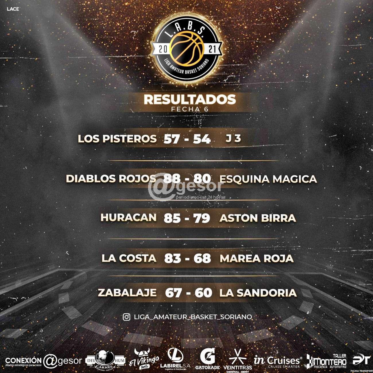 Culminada la sexta fecha del torneo de la Liga Amateur de Basket que viene disputándose en el gimnasio "Mario E. Bellini" del Club Remeros Mercedes y que este domingo 22 llevó adelante esta nueva jornada, con los resultados que informamos al momento que iban sucediendo, la tabla de posiciones de esta etapa clasificatoria a la siguiente fase, tiene ahora tres líderes: Diablos Rojos, Marea Roja y Zabalaje, todos ellos con 5 partidos ganados y uno perdido, cabe señalar que el equipo La Costa tiene pendiente de jugar un encuentro ante J3 de Fray Bentos que no se disputara por condiciones atmosféricas y que se tomó la previsión de no hacer viajar a los fraybentinos, que en caso de ganarlo La Costa también se sumaría a los líderes, ya que hoy tiene 4 juegos ganados y uno perdido.