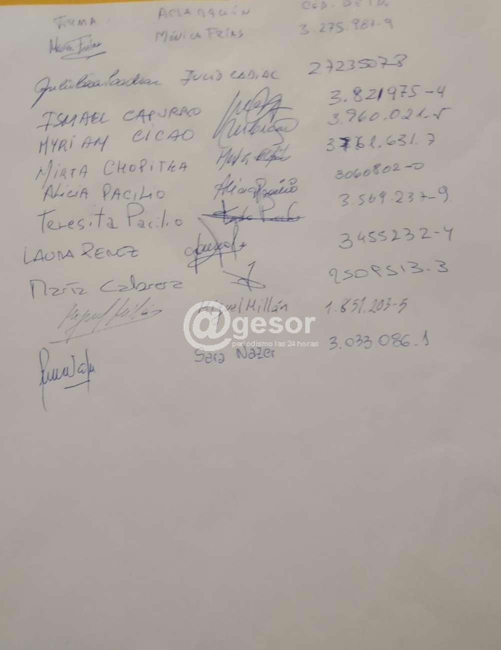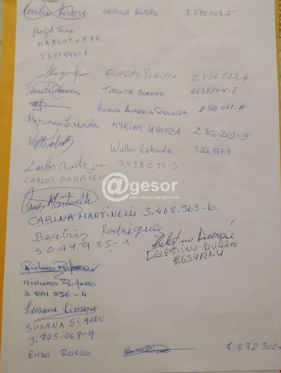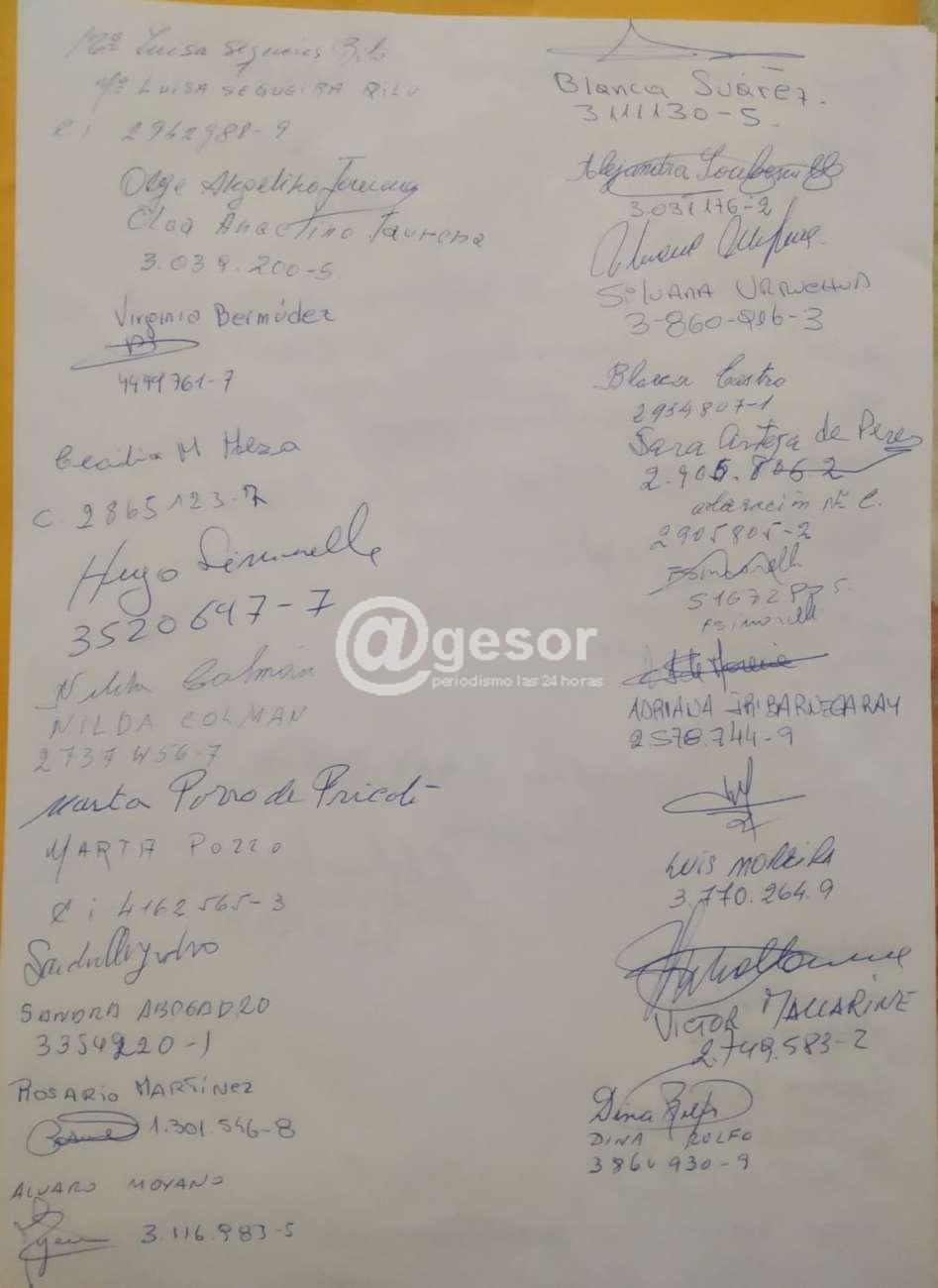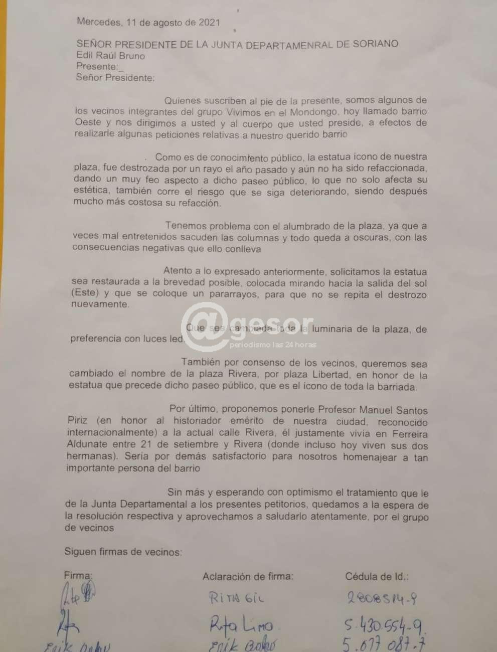 Adjunto petitorio de vecinos de la Plaza Rivera reclamando su pronta recuperación, y mientras que se atienda la iluminación, vigilancia, y en el futuro considerar cambios en el nomenclátor del barrio. Siguen a la carta 47 firmas de vecinos autodenominados “Del Mondongo”.