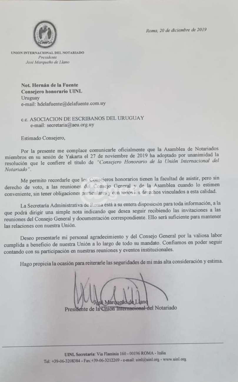 El 27 de diciembre del año 2019, el abajo firmante edil  departamental Luis Rico, solicitaba un homenaje y reconocimiento a través de una sesión extraordinaria ,al escribano  Hernán de la Fuente, por ser  nominado consejero honorario de la Unión Internacional del Notariado .