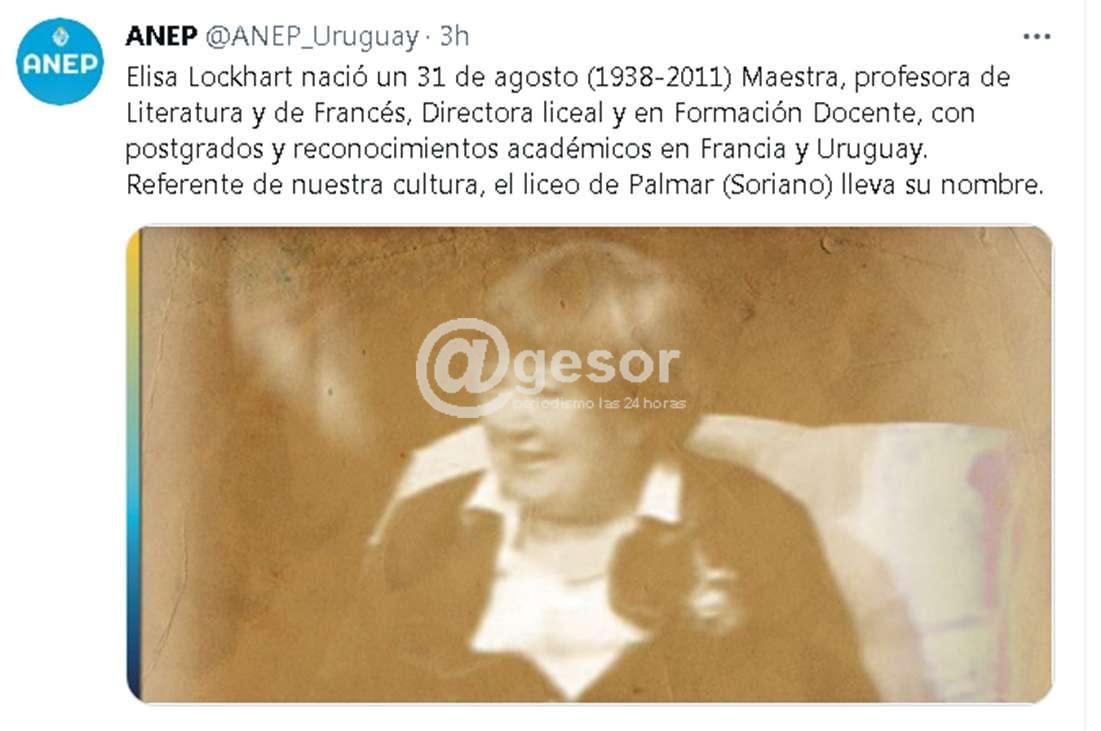 “Elisa Lockhart nació un 31 de agosto (1938-2011) Maestra, profesora de Literatura y de Francés, Directora liceal y en Formación Docente, con postgrados y reconocimientos académicos en Francia y Uruguay. Referente de nuestra cultura, el liceo de Palmar (Soriano) lleva su nombre” expresa ANEP en su twitter.