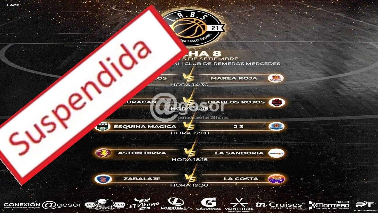 La organización de la Liga Amateur de Basket decidió suspender la programación de la 8a. y penúltima fecha del torneo que se disputaría este domingo 5 de setiembre en el gimnasio "Mario Bellini" del Club Remeros Mercedes.