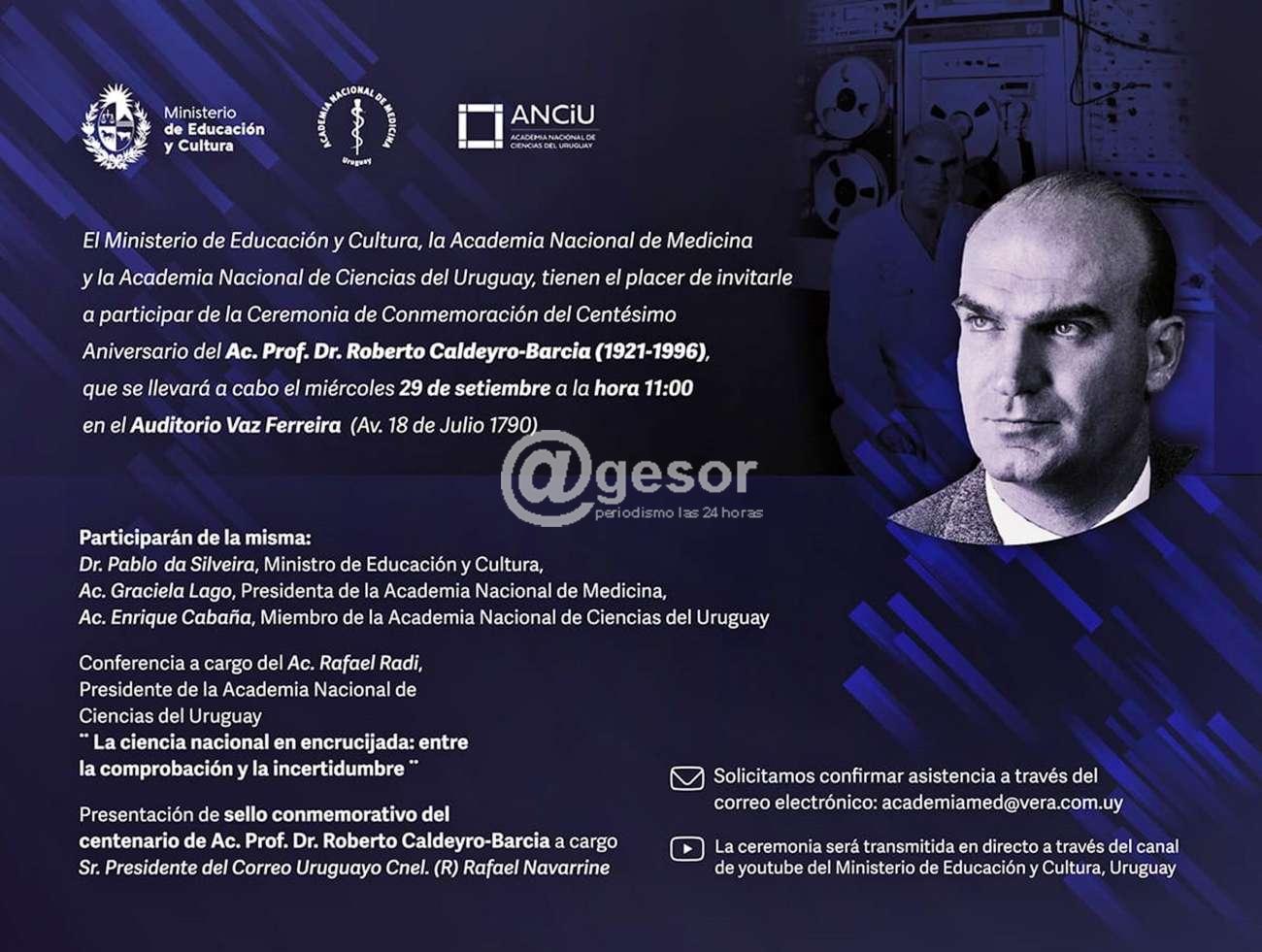 A 100 años de su nacimiento, el Ministerio de Educación y Cultura (MEC), la Academia Nacional de Medicina y la Academia Nacional de Ciencias del Uruguay (ANCiU) llevarán adelante una Ceremonia de Conmemoración del Centésimo Aniversario del Ac. Prof. Dr. Roberto CaldeyroBarcia. El evento será el miércoles 29 de setiembre a las 11:00 en el Auditorio Vaz Ferreira (Av. 18 de Julio 1790), y se transmitirá por YouTube desde el canal del MEC.