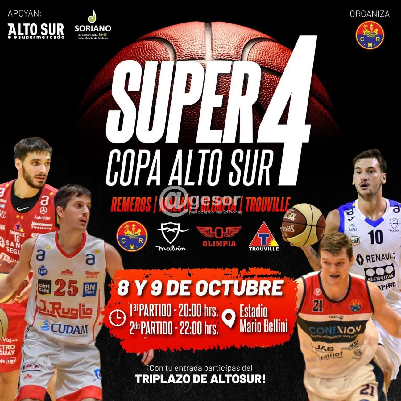 Como forma de ir "haciendo boca" hacia lo será tanto en la Liga Uruguaya con la presencia de tres equipos como Malvín, Olimpia y Trouville y el Competencia de la Liga Regional de Básquetbol de Soriano, el equipo del Club Remeros de Mercedes recibe a aquellos tres clubes en un gran "Súper 4" de baloncesto de primer nivel a disputarse durante este viernes 8 y sábado 9 en el gimnasio "Mario E. Bellini" estando en juego la Copa Alto Sur y a su vez con la etrada estará participándose del triplazo de Alto Sur.