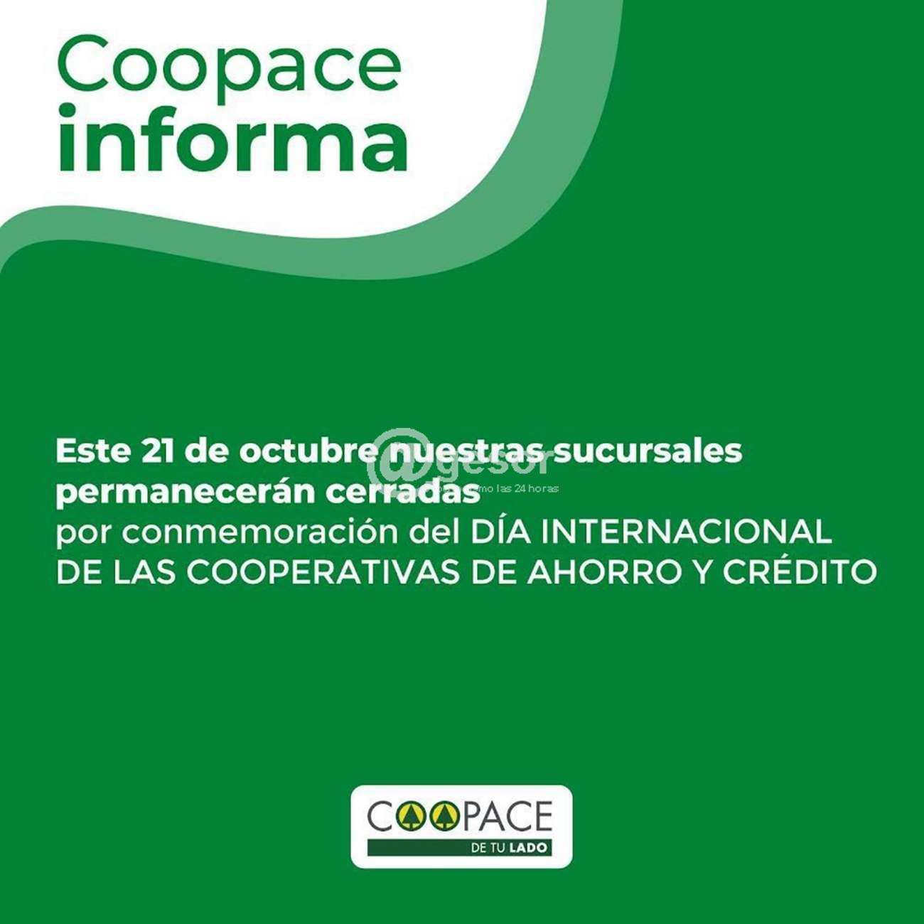 COOPACE informa: Este jueves nuestras sucrsales permanecerán cerradas por conmemoración del Día Internacional de las Cooperativas de Ahorro y Crédito
