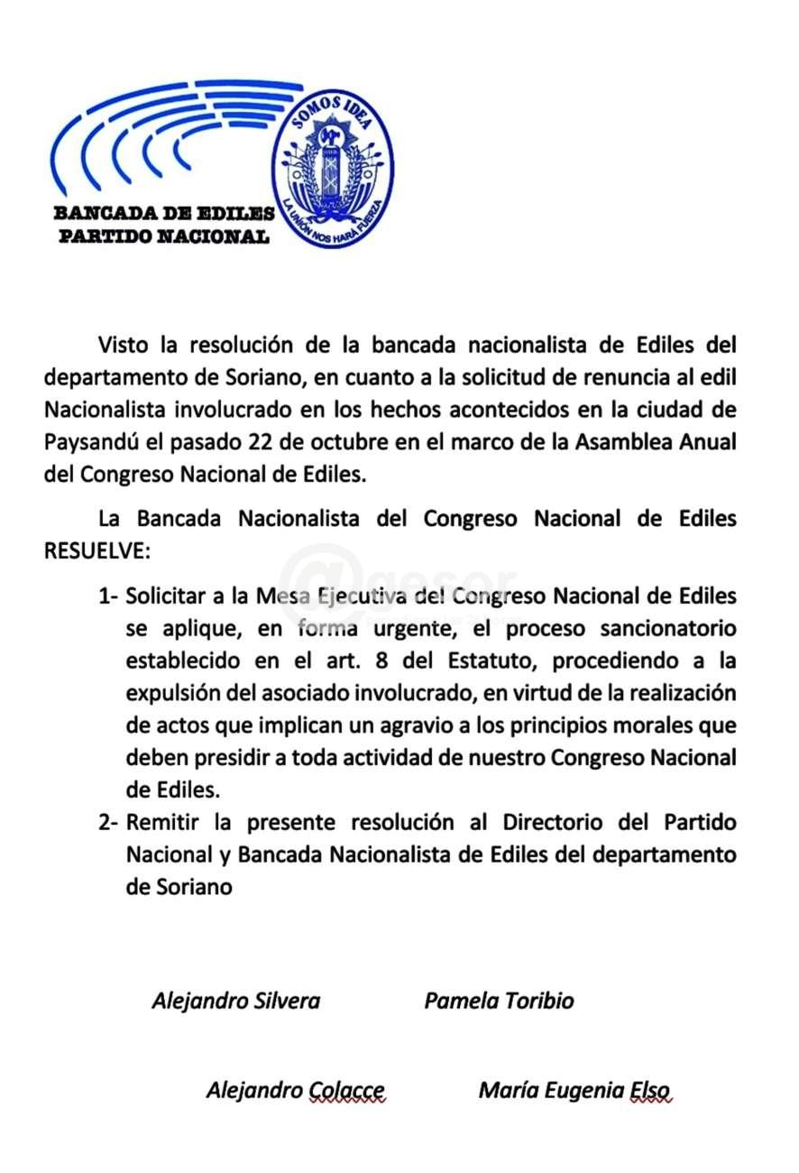 2- Remitir la presente resolución al Directorio del Partido Nacional y Bancada Nacionalista de Ediles del departamento de Soriano", firman Alejandro Silvera, Pamela Toribio, Alejandro Colacce y María Eugenia Elso.