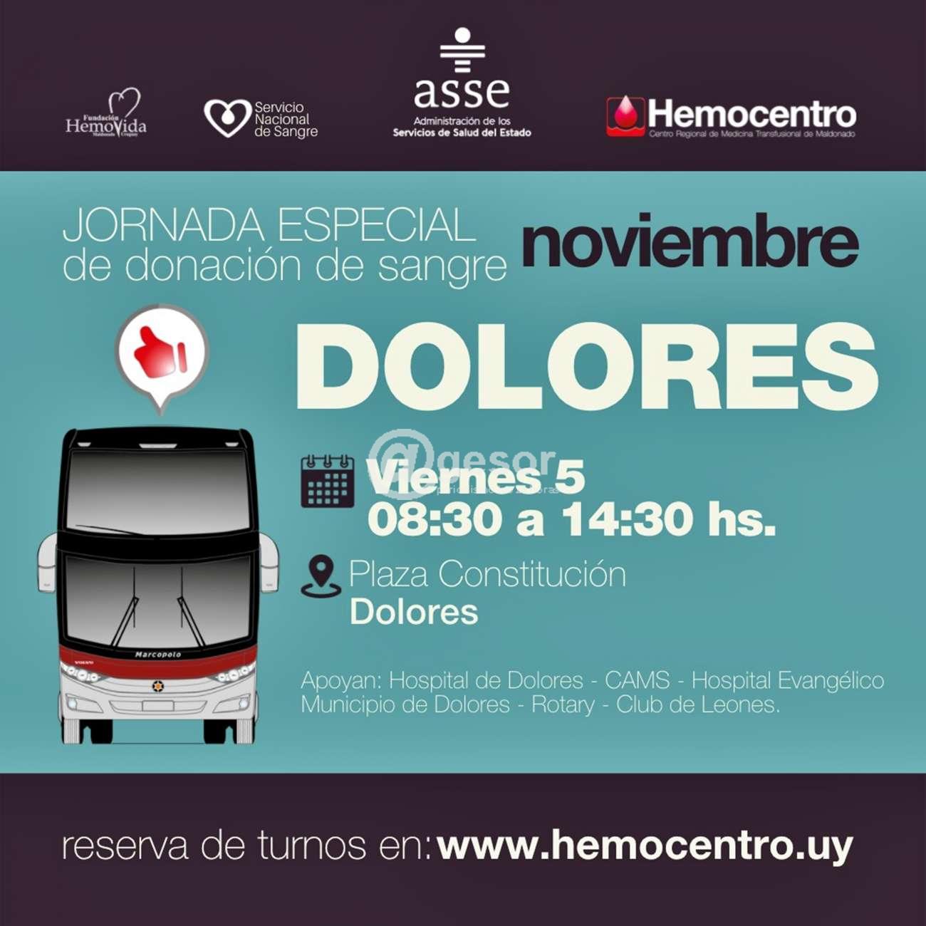 Con la organización de ASSE, de la Fundación Hemovida, el Servicio Nacional de Sandre y el Hemocentro Centro Regional de Medicina Transfusional de Maldonado, con el apoyo del Hospital de Dolores, CAMS, Hospital Evangélico, Municipio de Dolores, Rotary y Clubes de Leones, este viernes 5 de noviembre sse desarrolla en Dolores, Jorga especial de donación de sangre de 8.30 a 14.30 horas en plaza Constitución, pudiéndose reservar turnos a través de la página www.hemocentro.uy