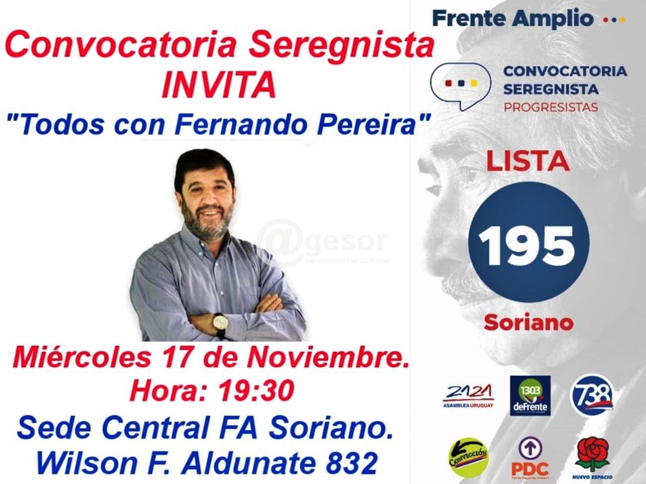 En sede de la Departamental del Frente Amplio en Mercedes, Wilson Ferreira Aldunate 832, este miércoles a las 19.30 horas estará recibiéndose al candidato a Presidente del Frente Amplio, Fernando Pereira, es una invitación de la Lista 195 Convocatoria Seregnista Progresistas, que han conformado Asamblea Uruguay, deFrente, Alianza Progresista, Convicción, Partido Demócrata Cristiano y Nuevo Espacio como forma de trabajar en unidad de cara a las elecciones del 5 de diciembre. ¡Te esperamos!